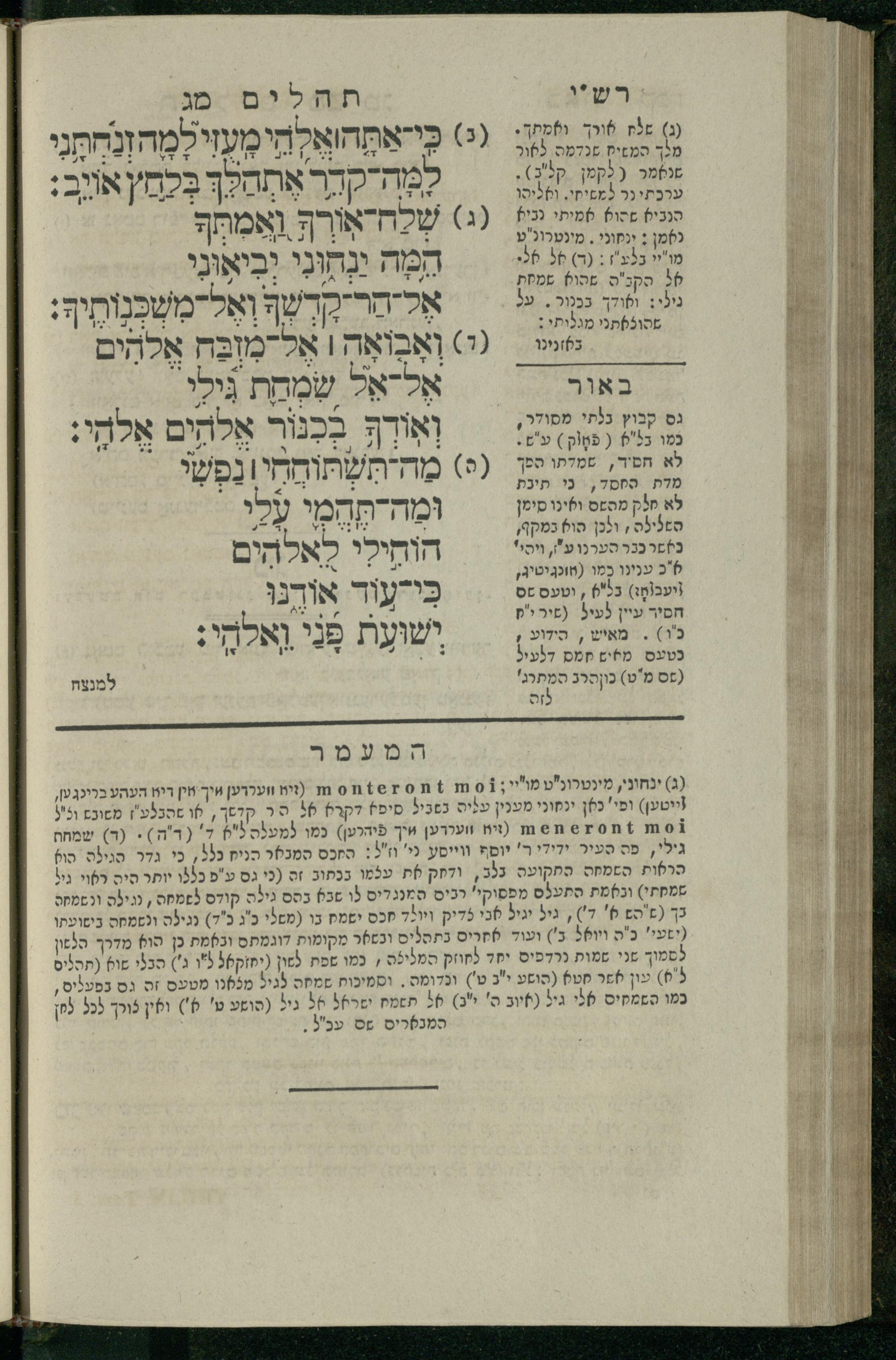 14 (1835) Sefer Tehilim : ʿim Perush Rashi ṿe-targum Ashkenazi me-et Rabenu Mosheh ben Menaḥem n.ʿE., u-veʾur me-et ha-ḥakham ha-mefursam R. Yoʾel Bril asher ḳara be-shem Zemirot Yiśraʾel, ṿe-nilṿeh elaṿ ha-Maʿamar me-et ha-ḥakham ha-medaḳdeḳ mo.h. Ṿolf Meʾir (moreh lashon ʿIvri be-vet ḥinukh ha-normali asher be-Prag), u-ve-tokho nikhlal haʿtaḳah u-veʾur le-khol milot be-laʿaz ha-nimtsaʾot be-Fe. Rashi z.l. / me-et ha-madpis Mosheh ha-Leṿi Landa14 (1835) ספר תהלים / עם פירוש רש״י ותרגום אשכנזי מאת רבינו משה בן מנחם נ״ע, ובאור מאת החכם המפורסם ר' יואל ברי״ל אשר קרא בשם זמירות ישראל, ונלוה אליו המעמר מאת החכם המדקדק מו״ה וואלף מאיר (מורה לשון עברי בבית חנוך הנארמאלי אשר בפראג), ובתוכו נכלל העתקה ובאור לכל מלות בלע״ז הנמצאות בפירש״י ז״ל מאת המדפיס משה הלוי לנדא