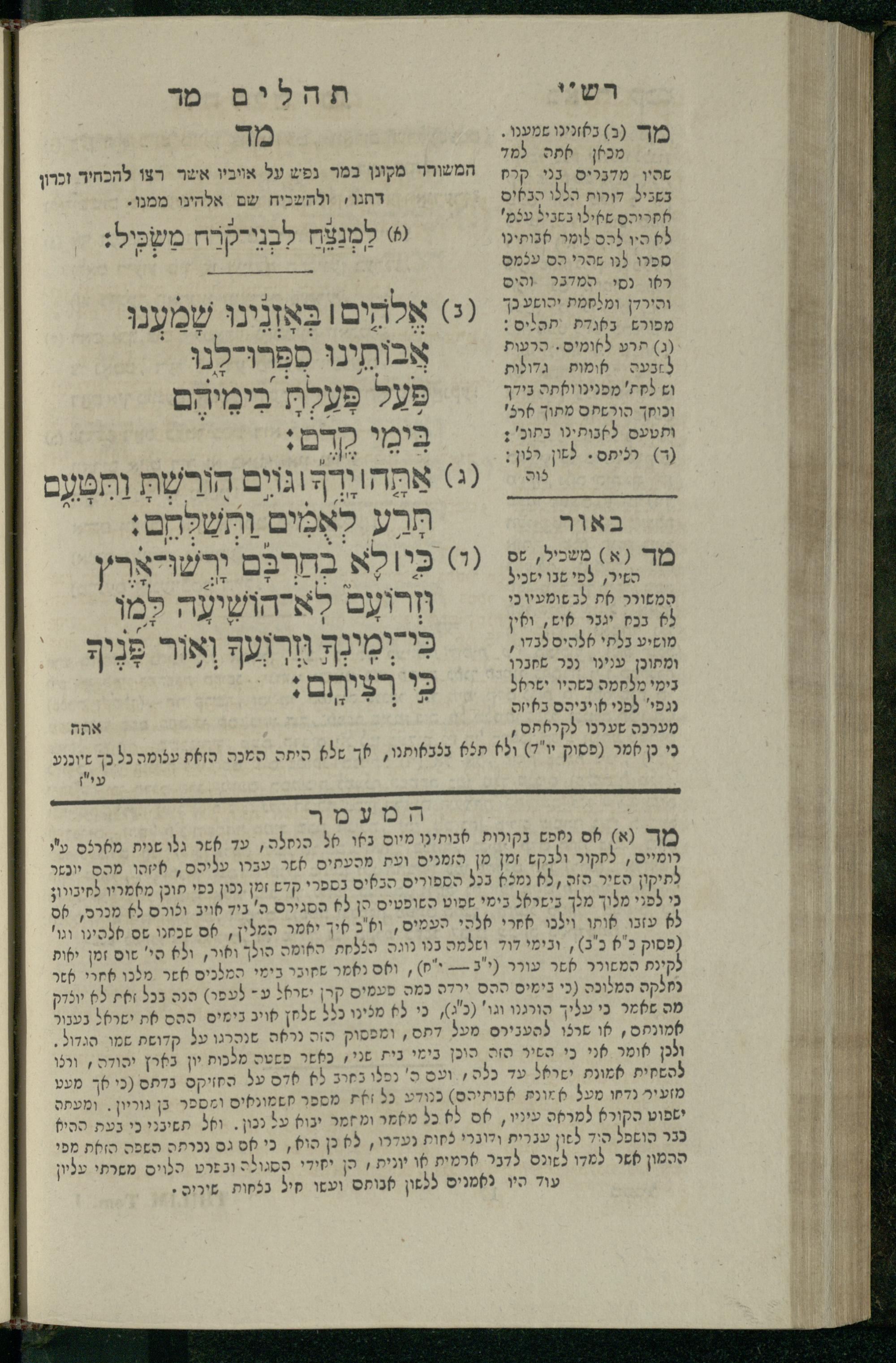 14 (1835) Sefer Tehilim : ʿim Perush Rashi ṿe-targum Ashkenazi me-et Rabenu Mosheh ben Menaḥem n.ʿE., u-veʾur me-et ha-ḥakham ha-mefursam R. Yoʾel Bril asher ḳara be-shem Zemirot Yiśraʾel, ṿe-nilṿeh elaṿ ha-Maʿamar me-et ha-ḥakham ha-medaḳdeḳ mo.h. Ṿolf Meʾir (moreh lashon ʿIvri be-vet ḥinukh ha-normali asher be-Prag), u-ve-tokho nikhlal haʿtaḳah u-veʾur le-khol milot be-laʿaz ha-nimtsaʾot be-Fe. Rashi z.l. / me-et ha-madpis Mosheh ha-Leṿi Landa14 (1835) ספר תהלים / עם פירוש רש״י ותרגום אשכנזי מאת רבינו משה בן מנחם נ״ע, ובאור מאת החכם המפורסם ר' יואל ברי״ל אשר קרא בשם זמירות ישראל, ונלוה אליו המעמר מאת החכם המדקדק מו״ה וואלף מאיר (מורה לשון עברי בבית חנוך הנארמאלי אשר בפראג), ובתוכו נכלל העתקה ובאור לכל מלות בלע״ז הנמצאות בפירש״י ז״ל מאת המדפיס משה הלוי לנדא
