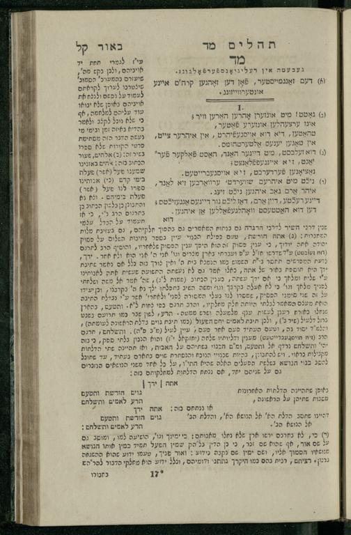 14 (1835) Sefer Tehilim : ʿim Perush Rashi ṿe-targum Ashkenazi me-et Rabenu Mosheh ben Menaḥem n.ʿE., u-veʾur me-et ha-ḥakham ha-mefursam R. Yoʾel Bril asher ḳara be-shem Zemirot Yiśraʾel, ṿe-nilṿeh elaṿ ha-Maʿamar me-et ha-ḥakham ha-medaḳdeḳ mo.h. Ṿolf Meʾir (moreh lashon ʿIvri be-vet ḥinukh ha-normali asher be-Prag), u-ve-tokho nikhlal haʿtaḳah u-veʾur le-khol milot be-laʿaz ha-nimtsaʾot be-Fe. Rashi z.l. / me-et ha-madpis Mosheh ha-Leṿi Landa14 (1835) ספר תהלים / עם פירוש רש״י ותרגום אשכנזי מאת רבינו משה בן מנחם נ״ע, ובאור מאת החכם המפורסם ר' יואל ברי״ל אשר קרא בשם זמירות ישראל, ונלוה אליו המעמר מאת החכם המדקדק מו״ה וואלף מאיר (מורה לשון עברי בבית חנוך הנארמאלי אשר בפראג), ובתוכו נכלל העתקה ובאור לכל מלות בלע״ז הנמצאות בפירש״י ז״ל מאת המדפיס משה הלוי לנדא