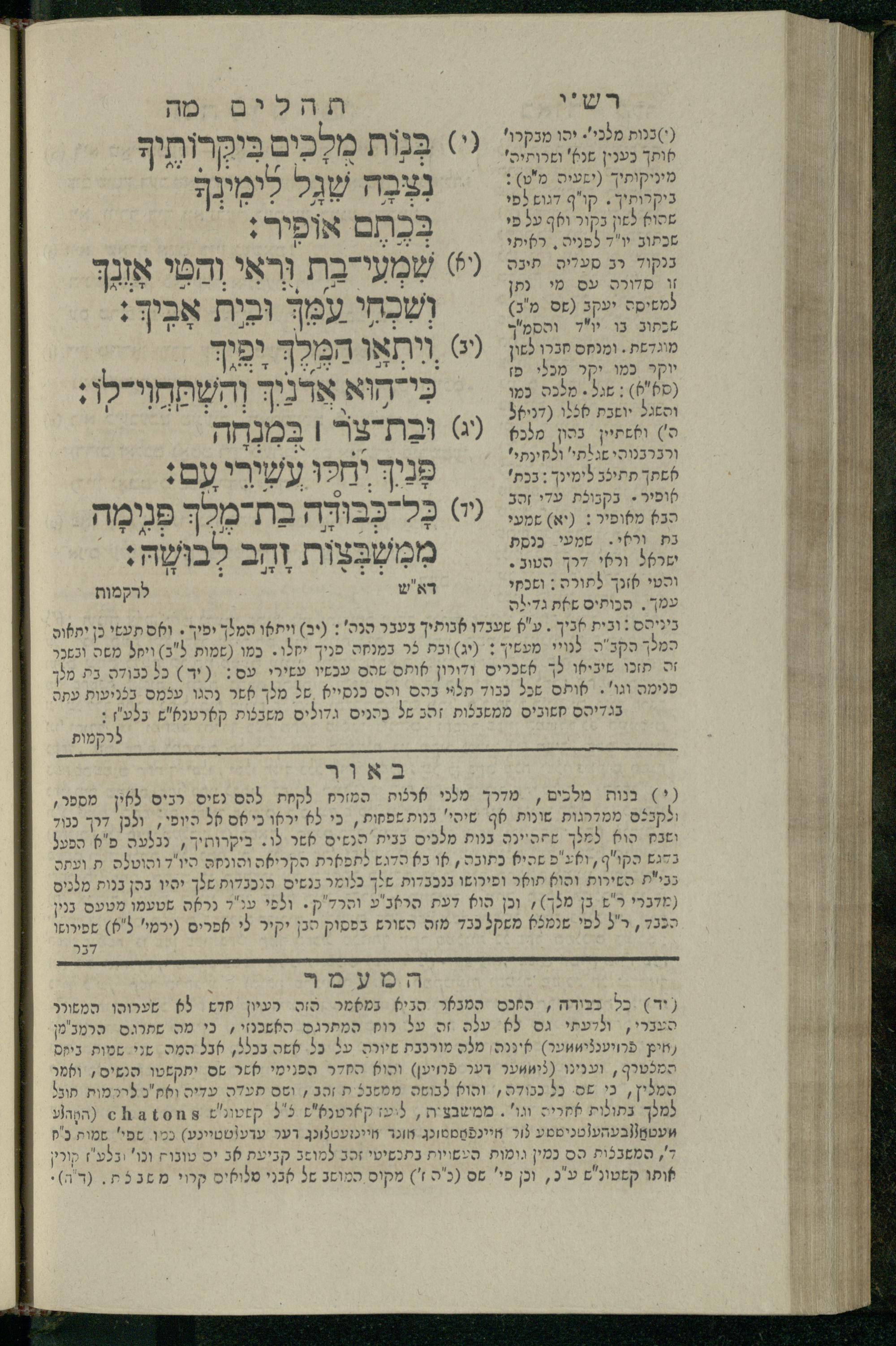 14 (1835) Sefer Tehilim : ʿim Perush Rashi ṿe-targum Ashkenazi me-et Rabenu Mosheh ben Menaḥem n.ʿE., u-veʾur me-et ha-ḥakham ha-mefursam R. Yoʾel Bril asher ḳara be-shem Zemirot Yiśraʾel, ṿe-nilṿeh elaṿ ha-Maʿamar me-et ha-ḥakham ha-medaḳdeḳ mo.h. Ṿolf Meʾir (moreh lashon ʿIvri be-vet ḥinukh ha-normali asher be-Prag), u-ve-tokho nikhlal haʿtaḳah u-veʾur le-khol milot be-laʿaz ha-nimtsaʾot be-Fe. Rashi z.l. / me-et ha-madpis Mosheh ha-Leṿi Landa14 (1835) ספר תהלים / עם פירוש רש״י ותרגום אשכנזי מאת רבינו משה בן מנחם נ״ע, ובאור מאת החכם המפורסם ר' יואל ברי״ל אשר קרא בשם זמירות ישראל, ונלוה אליו המעמר מאת החכם המדקדק מו״ה וואלף מאיר (מורה לשון עברי בבית חנוך הנארמאלי אשר בפראג), ובתוכו נכלל העתקה ובאור לכל מלות בלע״ז הנמצאות בפירש״י ז״ל מאת המדפיס משה הלוי לנדא