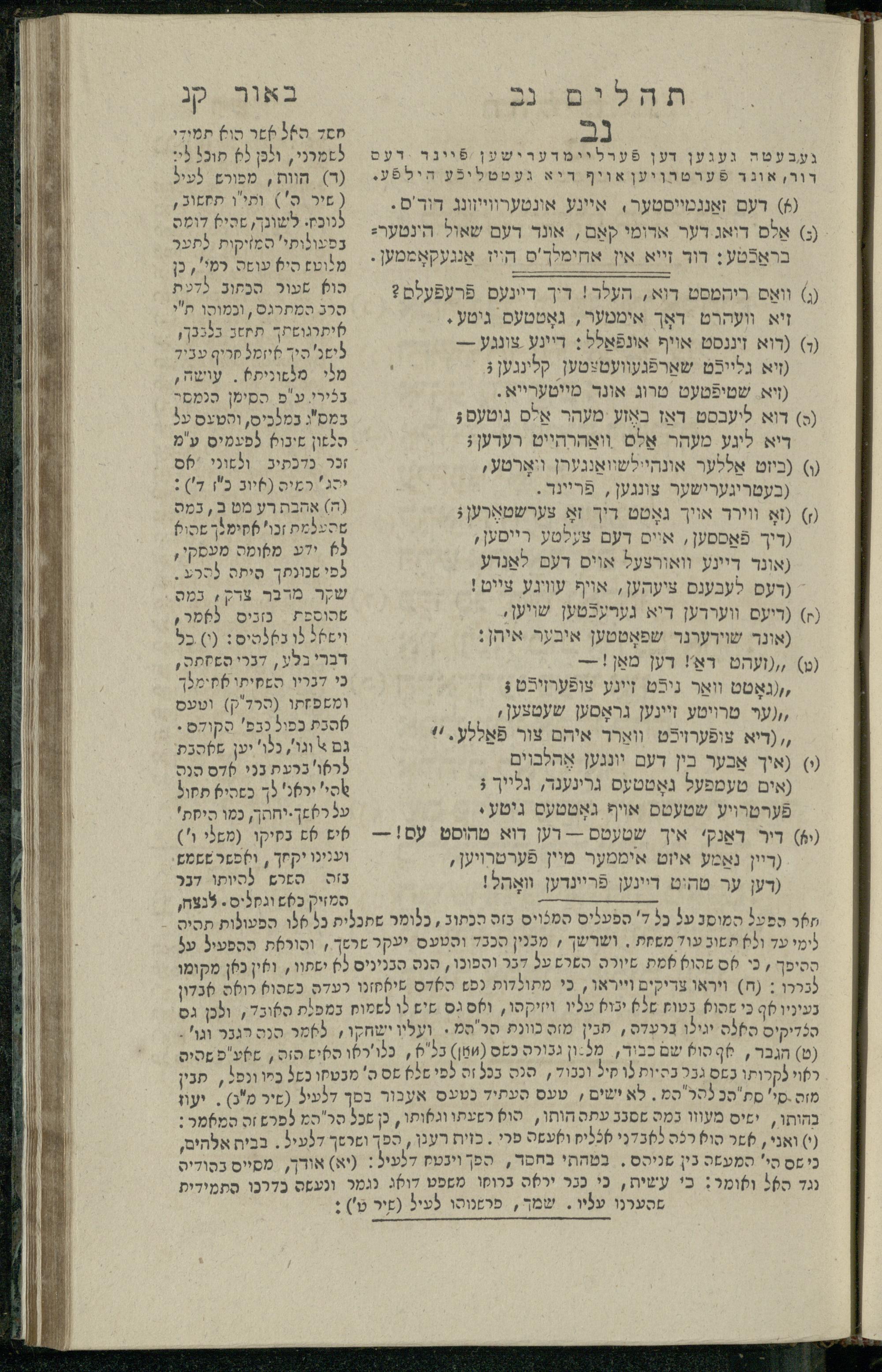 14 (1835) Sefer Tehilim : ʿim Perush Rashi ṿe-targum Ashkenazi me-et Rabenu Mosheh ben Menaḥem n.ʿE., u-veʾur me-et ha-ḥakham ha-mefursam R. Yoʾel Bril asher ḳara be-shem Zemirot Yiśraʾel, ṿe-nilṿeh elaṿ ha-Maʿamar me-et ha-ḥakham ha-medaḳdeḳ mo.h. Ṿolf Meʾir (moreh lashon ʿIvri be-vet ḥinukh ha-normali asher be-Prag), u-ve-tokho nikhlal haʿtaḳah u-veʾur le-khol milot be-laʿaz ha-nimtsaʾot be-Fe. Rashi z.l. / me-et ha-madpis Mosheh ha-Leṿi Landa14 (1835) ספר תהלים / עם פירוש רש״י ותרגום אשכנזי מאת רבינו משה בן מנחם נ״ע, ובאור מאת החכם המפורסם ר' יואל ברי״ל אשר קרא בשם זמירות ישראל, ונלוה אליו המעמר מאת החכם המדקדק מו״ה וואלף מאיר (מורה לשון עברי בבית חנוך הנארמאלי אשר בפראג), ובתוכו נכלל העתקה ובאור לכל מלות בלע״ז הנמצאות בפירש״י ז״ל מאת המדפיס משה הלוי לנדא