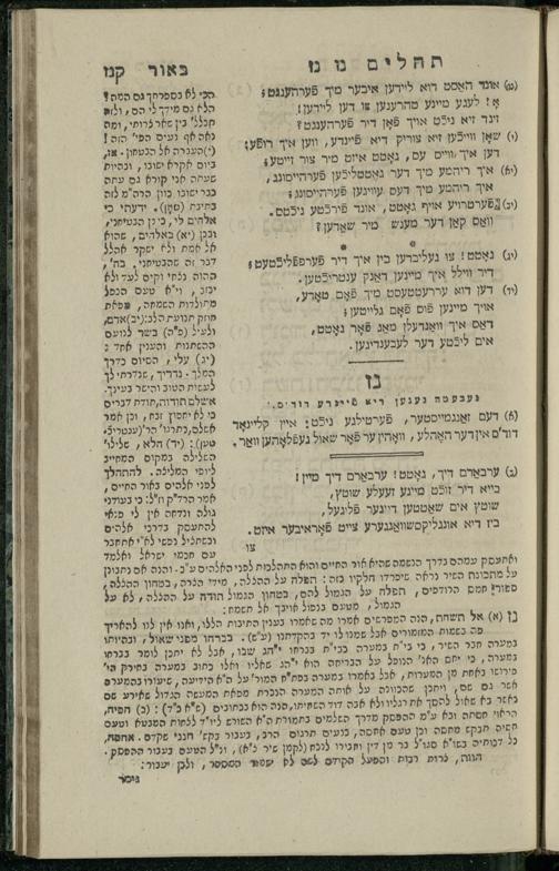 14 (1835) Sefer Tehilim : ʿim Perush Rashi ṿe-targum Ashkenazi me-et Rabenu Mosheh ben Menaḥem n.ʿE., u-veʾur me-et ha-ḥakham ha-mefursam R. Yoʾel Bril asher ḳara be-shem Zemirot Yiśraʾel, ṿe-nilṿeh elaṿ ha-Maʿamar me-et ha-ḥakham ha-medaḳdeḳ mo.h. Ṿolf Meʾir (moreh lashon ʿIvri be-vet ḥinukh ha-normali asher be-Prag), u-ve-tokho nikhlal haʿtaḳah u-veʾur le-khol milot be-laʿaz ha-nimtsaʾot be-Fe. Rashi z.l. / me-et ha-madpis Mosheh ha-Leṿi Landa14 (1835) ספר תהלים / עם פירוש רש״י ותרגום אשכנזי מאת רבינו משה בן מנחם נ״ע, ובאור מאת החכם המפורסם ר' יואל ברי״ל אשר קרא בשם זמירות ישראל, ונלוה אליו המעמר מאת החכם המדקדק מו״ה וואלף מאיר (מורה לשון עברי בבית חנוך הנארמאלי אשר בפראג), ובתוכו נכלל העתקה ובאור לכל מלות בלע״ז הנמצאות בפירש״י ז״ל מאת המדפיס משה הלוי לנדא