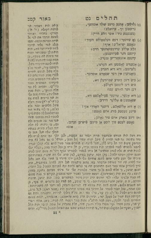 14 (1835) Sefer Tehilim : ʿim Perush Rashi ṿe-targum Ashkenazi me-et Rabenu Mosheh ben Menaḥem n.ʿE., u-veʾur me-et ha-ḥakham ha-mefursam R. Yoʾel Bril asher ḳara be-shem Zemirot Yiśraʾel, ṿe-nilṿeh elaṿ ha-Maʿamar me-et ha-ḥakham ha-medaḳdeḳ mo.h. Ṿolf Meʾir (moreh lashon ʿIvri be-vet ḥinukh ha-normali asher be-Prag), u-ve-tokho nikhlal haʿtaḳah u-veʾur le-khol milot be-laʿaz ha-nimtsaʾot be-Fe. Rashi z.l. / me-et ha-madpis Mosheh ha-Leṿi Landa14 (1835) ספר תהלים / עם פירוש רש״י ותרגום אשכנזי מאת רבינו משה בן מנחם נ״ע, ובאור מאת החכם המפורסם ר' יואל ברי״ל אשר קרא בשם זמירות ישראל, ונלוה אליו המעמר מאת החכם המדקדק מו״ה וואלף מאיר (מורה לשון עברי בבית חנוך הנארמאלי אשר בפראג), ובתוכו נכלל העתקה ובאור לכל מלות בלע״ז הנמצאות בפירש״י ז״ל מאת המדפיס משה הלוי לנדא