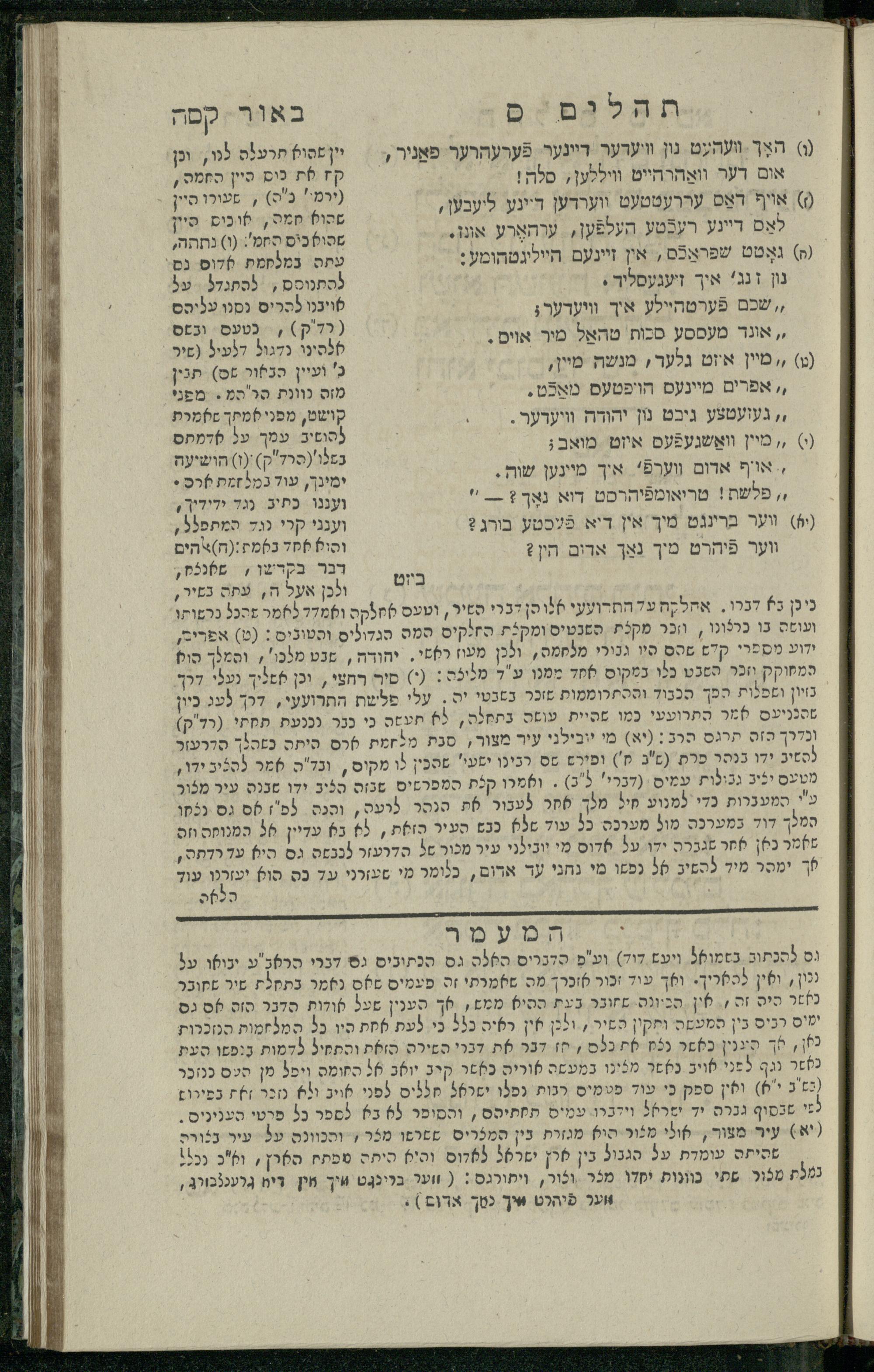 14 (1835) Sefer Tehilim : ʿim Perush Rashi ṿe-targum Ashkenazi me-et Rabenu Mosheh ben Menaḥem n.ʿE., u-veʾur me-et ha-ḥakham ha-mefursam R. Yoʾel Bril asher ḳara be-shem Zemirot Yiśraʾel, ṿe-nilṿeh elaṿ ha-Maʿamar me-et ha-ḥakham ha-medaḳdeḳ mo.h. Ṿolf Meʾir (moreh lashon ʿIvri be-vet ḥinukh ha-normali asher be-Prag), u-ve-tokho nikhlal haʿtaḳah u-veʾur le-khol milot be-laʿaz ha-nimtsaʾot be-Fe. Rashi z.l. / me-et ha-madpis Mosheh ha-Leṿi Landa14 (1835) ספר תהלים / עם פירוש רש״י ותרגום אשכנזי מאת רבינו משה בן מנחם נ״ע, ובאור מאת החכם המפורסם ר' יואל ברי״ל אשר קרא בשם זמירות ישראל, ונלוה אליו המעמר מאת החכם המדקדק מו״ה וואלף מאיר (מורה לשון עברי בבית חנוך הנארמאלי אשר בפראג), ובתוכו נכלל העתקה ובאור לכל מלות בלע״ז הנמצאות בפירש״י ז״ל מאת המדפיס משה הלוי לנדא