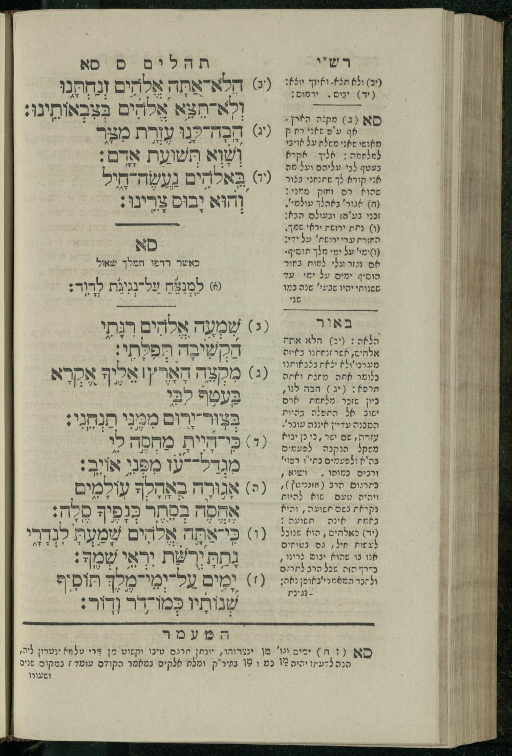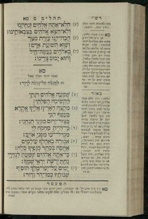 14 (1835) Sefer Tehilim : ʿim Perush Rashi ṿe-targum Ashkenazi me-et Rabenu Mosheh ben Menaḥem n.ʿE., u-veʾur me-et ha-ḥakham ha-mefursam R. Yoʾel Bril asher ḳara be-shem Zemirot Yiśraʾel, ṿe-nilṿeh elaṿ ha-Maʿamar me-et ha-ḥakham ha-medaḳdeḳ mo.h. Ṿolf Meʾir (moreh lashon ʿIvri be-vet ḥinukh ha-normali asher be-Prag), u-ve-tokho nikhlal haʿtaḳah u-veʾur le-khol milot be-laʿaz ha-nimtsaʾot be-Fe. Rashi z.l. / me-et ha-madpis Mosheh ha-Leṿi Landa14 (1835) ספר תהלים / עם פירוש רש״י ותרגום אשכנזי מאת רבינו משה בן מנחם נ״ע, ובאור מאת החכם המפורסם ר' יואל ברי״ל אשר קרא בשם זמירות ישראל, ונלוה אליו המעמר מאת החכם המדקדק מו״ה וואלף מאיר (מורה לשון עברי בבית חנוך הנארמאלי אשר בפראג), ובתוכו נכלל העתקה ובאור לכל מלות בלע״ז הנמצאות בפירש״י ז״ל מאת המדפיס משה הלוי לנדא