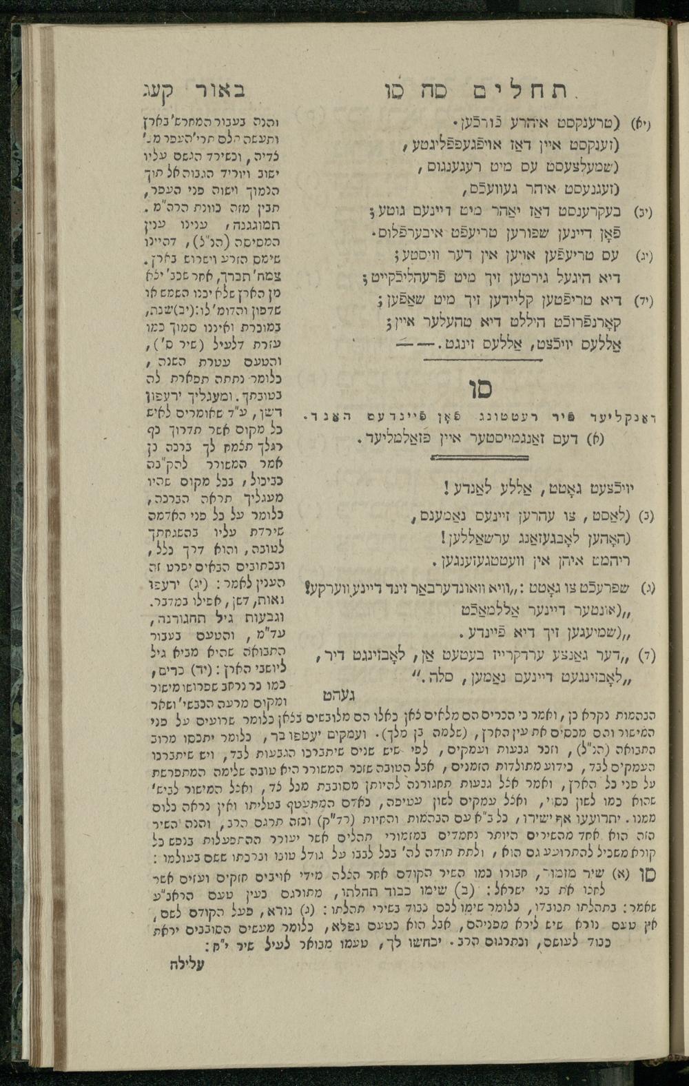 14 (1835) Sefer Tehilim : ʿim Perush Rashi ṿe-targum Ashkenazi me-et Rabenu Mosheh ben Menaḥem n.ʿE., u-veʾur me-et ha-ḥakham ha-mefursam R. Yoʾel Bril asher ḳara be-shem Zemirot Yiśraʾel, ṿe-nilṿeh elaṿ ha-Maʿamar me-et ha-ḥakham ha-medaḳdeḳ mo.h. Ṿolf Meʾir (moreh lashon ʿIvri be-vet ḥinukh ha-normali asher be-Prag), u-ve-tokho nikhlal haʿtaḳah u-veʾur le-khol milot be-laʿaz ha-nimtsaʾot be-Fe. Rashi z.l. / me-et ha-madpis Mosheh ha-Leṿi Landa14 (1835) ספר תהלים / עם פירוש רש״י ותרגום אשכנזי מאת רבינו משה בן מנחם נ״ע, ובאור מאת החכם המפורסם ר' יואל ברי״ל אשר קרא בשם זמירות ישראל, ונלוה אליו המעמר מאת החכם המדקדק מו״ה וואלף מאיר (מורה לשון עברי בבית חנוך הנארמאלי אשר בפראג), ובתוכו נכלל העתקה ובאור לכל מלות בלע״ז הנמצאות בפירש״י ז״ל מאת המדפיס משה הלוי לנדא