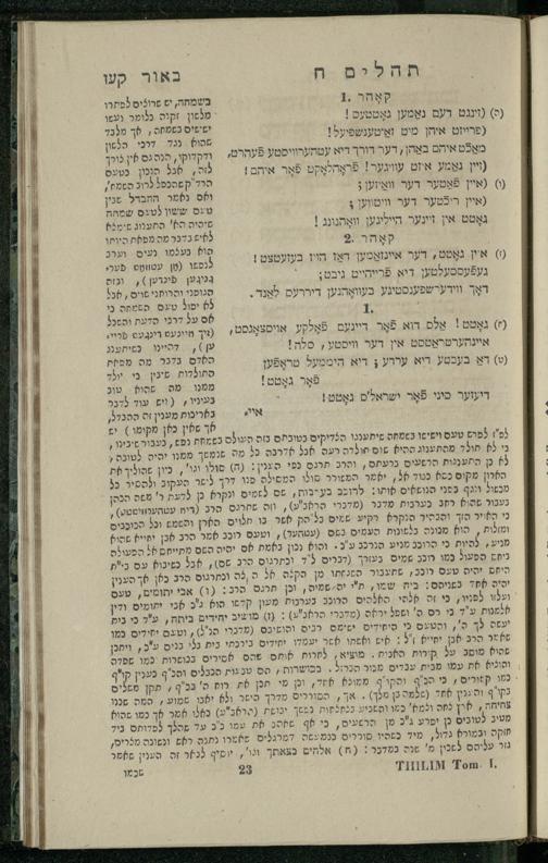 14 (1835) Sefer Tehilim : ʿim Perush Rashi ṿe-targum Ashkenazi me-et Rabenu Mosheh ben Menaḥem n.ʿE., u-veʾur me-et ha-ḥakham ha-mefursam R. Yoʾel Bril asher ḳara be-shem Zemirot Yiśraʾel, ṿe-nilṿeh elaṿ ha-Maʿamar me-et ha-ḥakham ha-medaḳdeḳ mo.h. Ṿolf Meʾir (moreh lashon ʿIvri be-vet ḥinukh ha-normali asher be-Prag), u-ve-tokho nikhlal haʿtaḳah u-veʾur le-khol milot be-laʿaz ha-nimtsaʾot be-Fe. Rashi z.l. / me-et ha-madpis Mosheh ha-Leṿi Landa14 (1835) ספר תהלים / עם פירוש רש״י ותרגום אשכנזי מאת רבינו משה בן מנחם נ״ע, ובאור מאת החכם המפורסם ר' יואל ברי״ל אשר קרא בשם זמירות ישראל, ונלוה אליו המעמר מאת החכם המדקדק מו״ה וואלף מאיר (מורה לשון עברי בבית חנוך הנארמאלי אשר בפראג), ובתוכו נכלל העתקה ובאור לכל מלות בלע״ז הנמצאות בפירש״י ז״ל מאת המדפיס משה הלוי לנדא