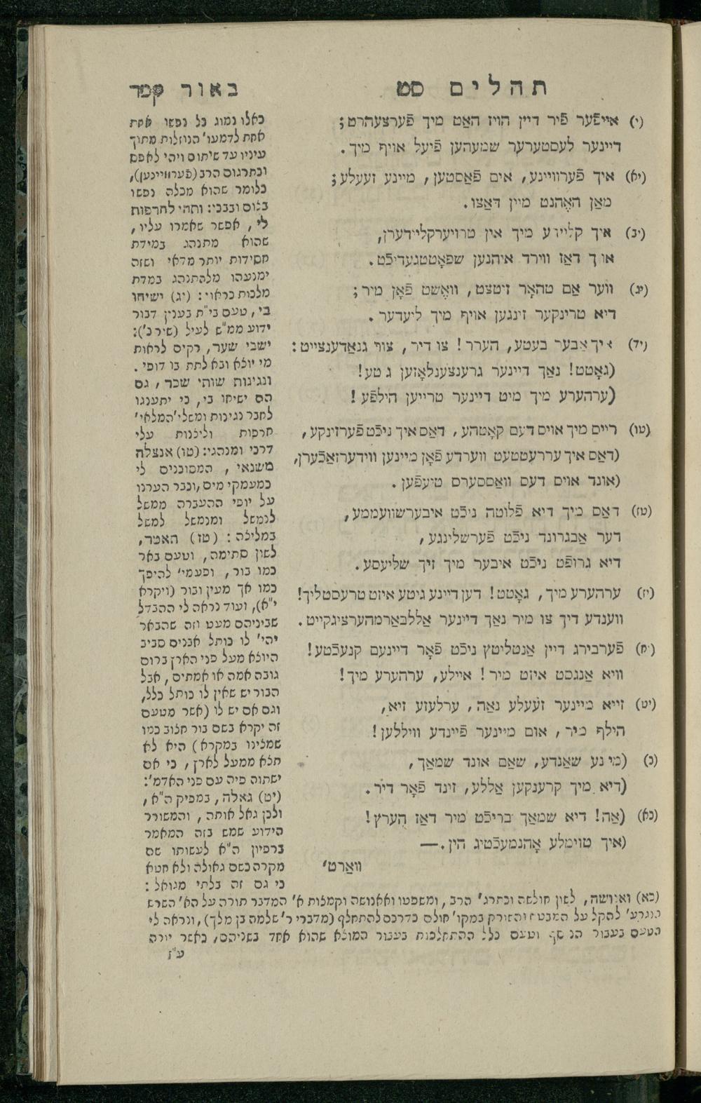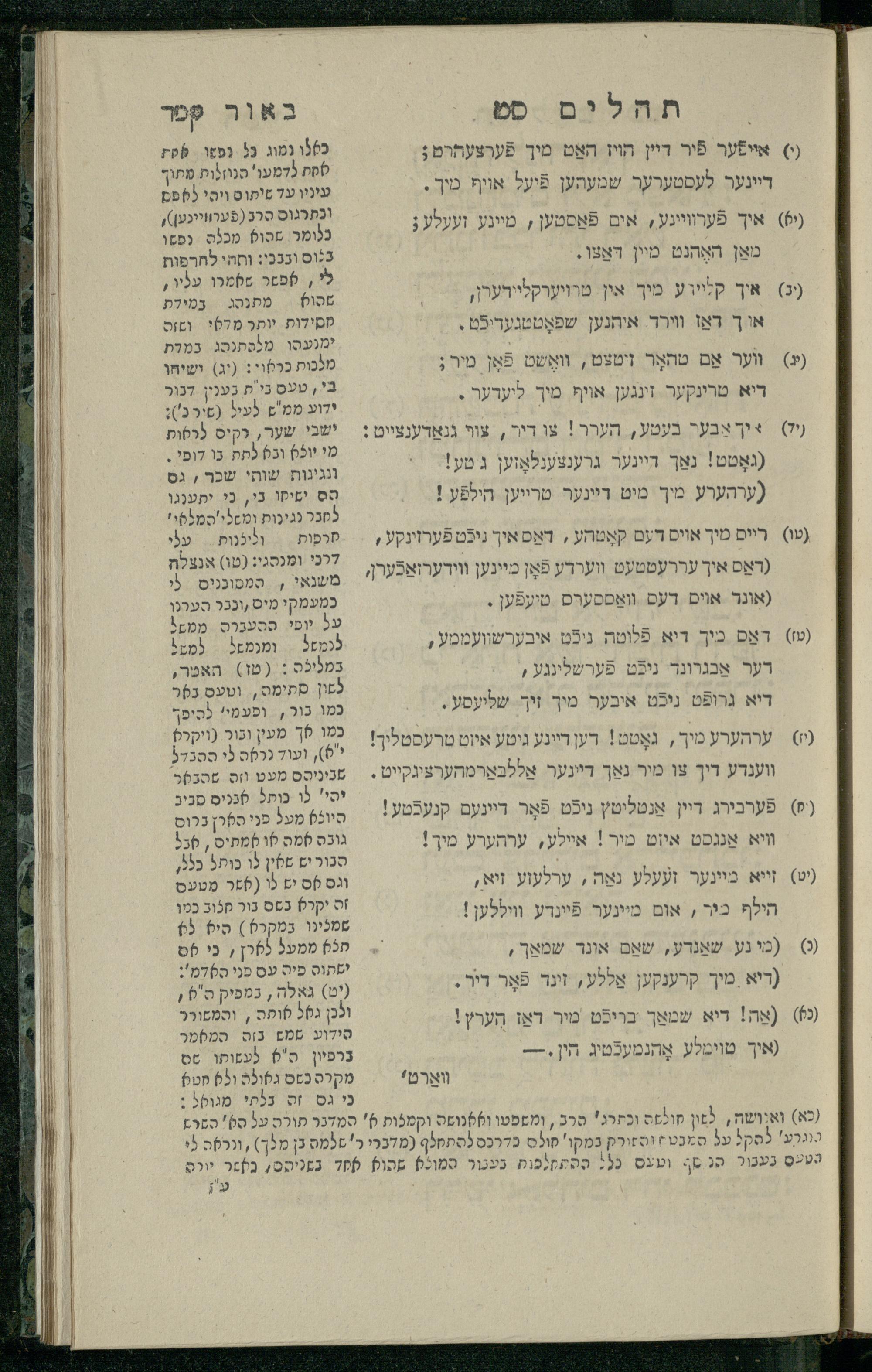 14 (1835) Sefer Tehilim : ʿim Perush Rashi ṿe-targum Ashkenazi me-et Rabenu Mosheh ben Menaḥem n.ʿE., u-veʾur me-et ha-ḥakham ha-mefursam R. Yoʾel Bril asher ḳara be-shem Zemirot Yiśraʾel, ṿe-nilṿeh elaṿ ha-Maʿamar me-et ha-ḥakham ha-medaḳdeḳ mo.h. Ṿolf Meʾir (moreh lashon ʿIvri be-vet ḥinukh ha-normali asher be-Prag), u-ve-tokho nikhlal haʿtaḳah u-veʾur le-khol milot be-laʿaz ha-nimtsaʾot be-Fe. Rashi z.l. / me-et ha-madpis Mosheh ha-Leṿi Landa14 (1835) ספר תהלים / עם פירוש רש״י ותרגום אשכנזי מאת רבינו משה בן מנחם נ״ע, ובאור מאת החכם המפורסם ר' יואל ברי״ל אשר קרא בשם זמירות ישראל, ונלוה אליו המעמר מאת החכם המדקדק מו״ה וואלף מאיר (מורה לשון עברי בבית חנוך הנארמאלי אשר בפראג), ובתוכו נכלל העתקה ובאור לכל מלות בלע״ז הנמצאות בפירש״י ז״ל מאת המדפיס משה הלוי לנדא
