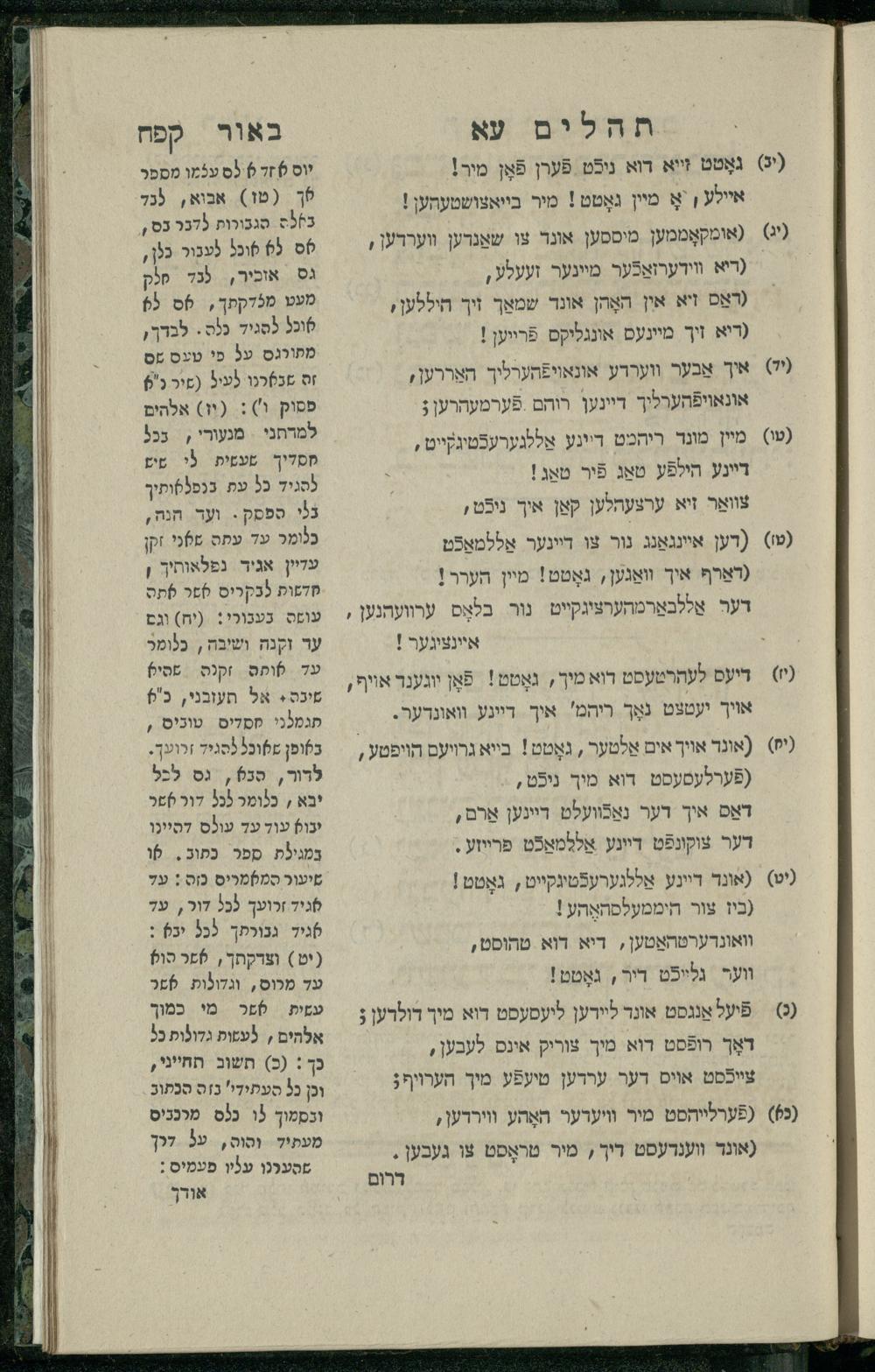 14 (1835) Sefer Tehilim : ʿim Perush Rashi ṿe-targum Ashkenazi me-et Rabenu Mosheh ben Menaḥem n.ʿE., u-veʾur me-et ha-ḥakham ha-mefursam R. Yoʾel Bril asher ḳara be-shem Zemirot Yiśraʾel, ṿe-nilṿeh elaṿ ha-Maʿamar me-et ha-ḥakham ha-medaḳdeḳ mo.h. Ṿolf Meʾir (moreh lashon ʿIvri be-vet ḥinukh ha-normali asher be-Prag), u-ve-tokho nikhlal haʿtaḳah u-veʾur le-khol milot be-laʿaz ha-nimtsaʾot be-Fe. Rashi z.l. / me-et ha-madpis Mosheh ha-Leṿi Landa14 (1835) ספר תהלים / עם פירוש רש״י ותרגום אשכנזי מאת רבינו משה בן מנחם נ״ע, ובאור מאת החכם המפורסם ר' יואל ברי״ל אשר קרא בשם זמירות ישראל, ונלוה אליו המעמר מאת החכם המדקדק מו״ה וואלף מאיר (מורה לשון עברי בבית חנוך הנארמאלי אשר בפראג), ובתוכו נכלל העתקה ובאור לכל מלות בלע״ז הנמצאות בפירש״י ז״ל מאת המדפיס משה הלוי לנדא