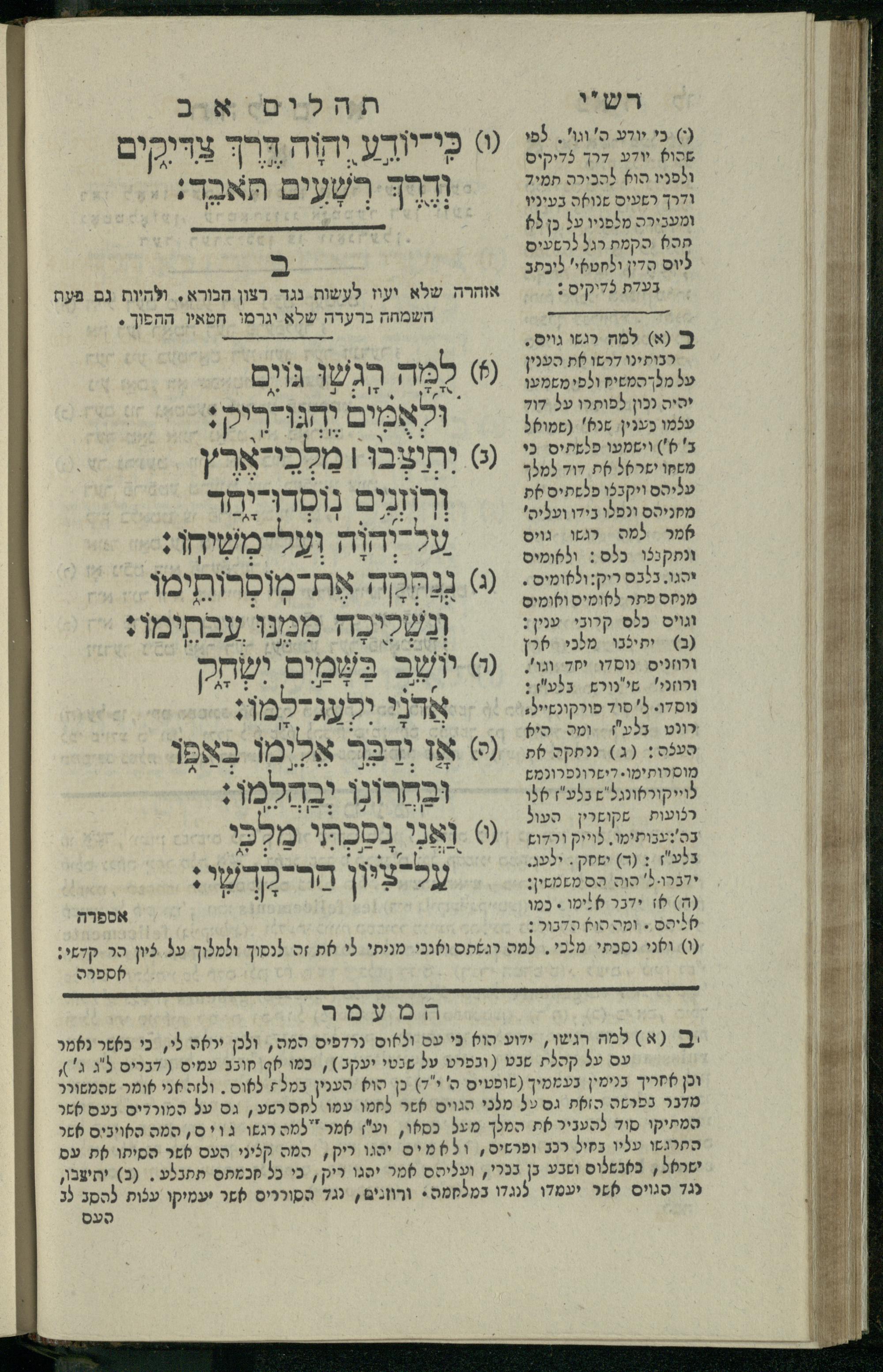 14 (1835) Sefer Tehilim : ʿim Perush Rashi ṿe-targum Ashkenazi me-et Rabenu Mosheh ben Menaḥem n.ʿE., u-veʾur me-et ha-ḥakham ha-mefursam R. Yoʾel Bril asher ḳara be-shem Zemirot Yiśraʾel, ṿe-nilṿeh elaṿ ha-Maʿamar me-et ha-ḥakham ha-medaḳdeḳ mo.h. Ṿolf Meʾir (moreh lashon ʿIvri be-vet ḥinukh ha-normali asher be-Prag), u-ve-tokho nikhlal haʿtaḳah u-veʾur le-khol milot be-laʿaz ha-nimtsaʾot be-Fe. Rashi z.l. / me-et ha-madpis Mosheh ha-Leṿi Landa14 (1835) ספר תהלים / עם פירוש רש״י ותרגום אשכנזי מאת רבינו משה בן מנחם נ״ע, ובאור מאת החכם המפורסם ר' יואל ברי״ל אשר קרא בשם זמירות ישראל, ונלוה אליו המעמר מאת החכם המדקדק מו״ה וואלף מאיר (מורה לשון עברי בבית חנוך הנארמאלי אשר בפראג), ובתוכו נכלל העתקה ובאור לכל מלות בלע״ז הנמצאות בפירש״י ז״ל מאת המדפיס משה הלוי לנדא