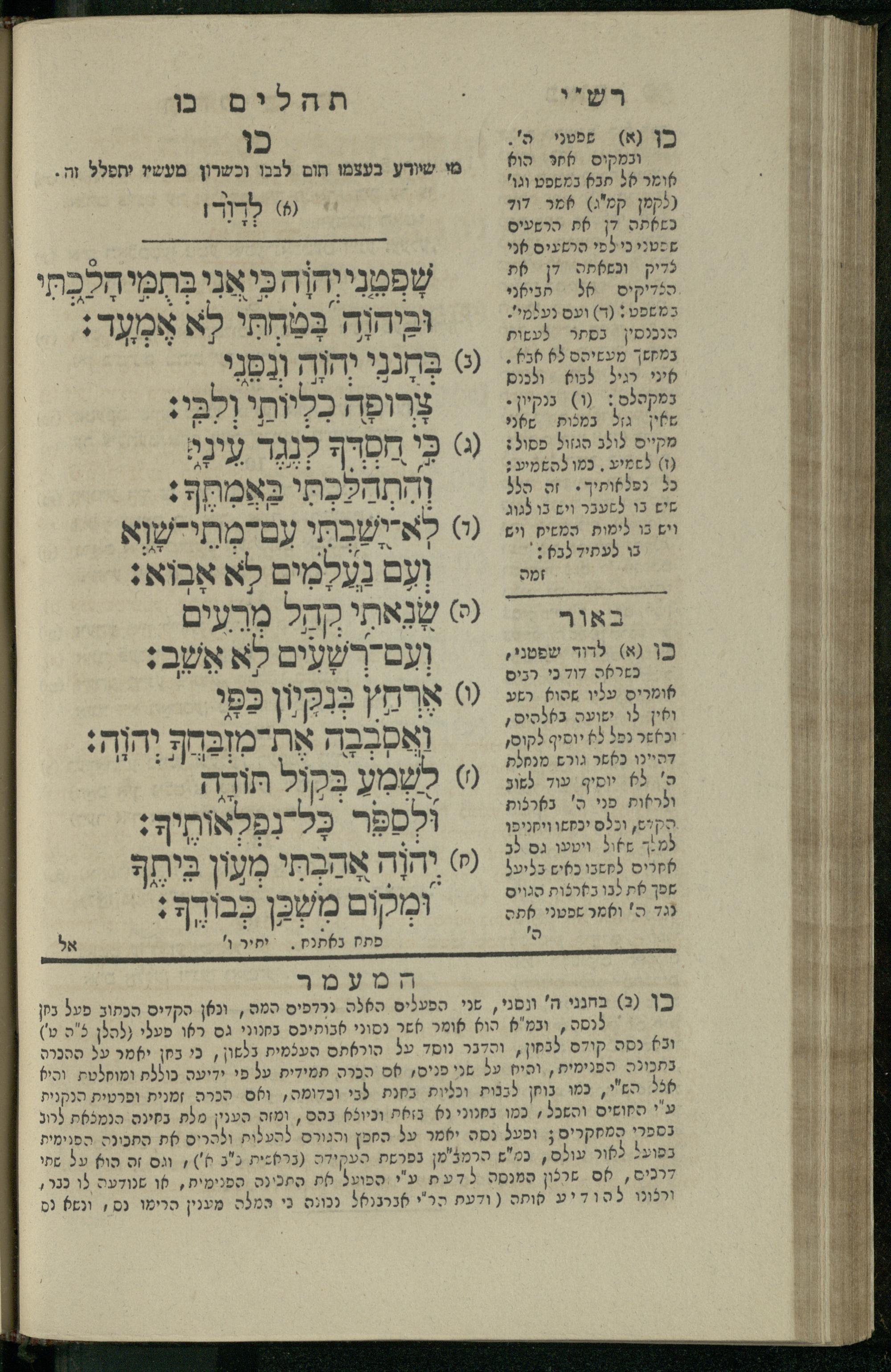 14 (1835) Sefer Tehilim : ʿim Perush Rashi ṿe-targum Ashkenazi me-et Rabenu Mosheh ben Menaḥem n.ʿE., u-veʾur me-et ha-ḥakham ha-mefursam R. Yoʾel Bril asher ḳara be-shem Zemirot Yiśraʾel, ṿe-nilṿeh elaṿ ha-Maʿamar me-et ha-ḥakham ha-medaḳdeḳ mo.h. Ṿolf Meʾir (moreh lashon ʿIvri be-vet ḥinukh ha-normali asher be-Prag), u-ve-tokho nikhlal haʿtaḳah u-veʾur le-khol milot be-laʿaz ha-nimtsaʾot be-Fe. Rashi z.l. / me-et ha-madpis Mosheh ha-Leṿi Landa14 (1835) ספר תהלים / עם פירוש רש״י ותרגום אשכנזי מאת רבינו משה בן מנחם נ״ע, ובאור מאת החכם המפורסם ר' יואל ברי״ל אשר קרא בשם זמירות ישראל, ונלוה אליו המעמר מאת החכם המדקדק מו״ה וואלף מאיר (מורה לשון עברי בבית חנוך הנארמאלי אשר בפראג), ובתוכו נכלל העתקה ובאור לכל מלות בלע״ז הנמצאות בפירש״י ז״ל מאת המדפיס משה הלוי לנדא