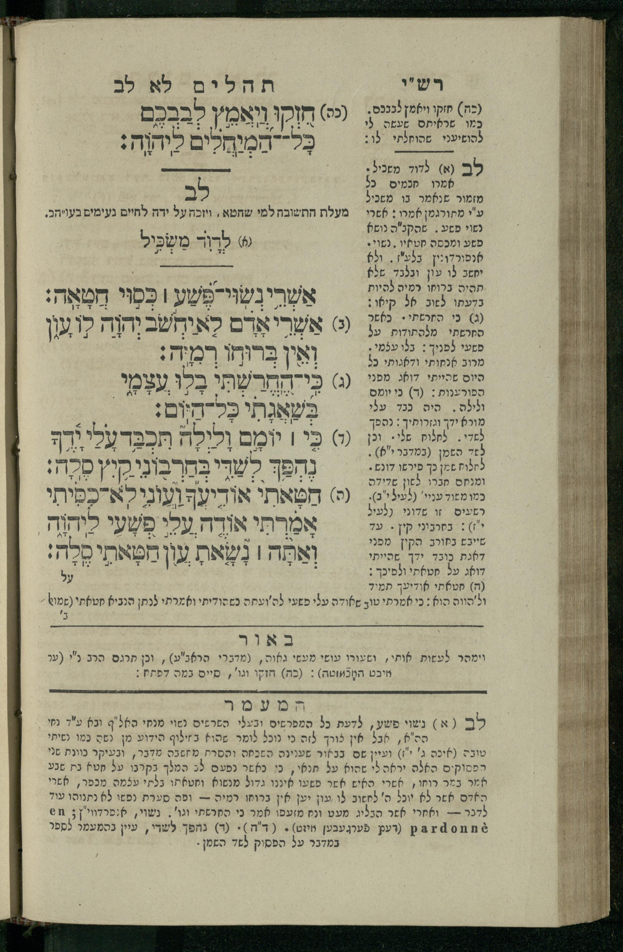 14 (1835) Sefer Tehilim : ʿim Perush Rashi ṿe-targum Ashkenazi me-et Rabenu Mosheh ben Menaḥem n.ʿE., u-veʾur me-et ha-ḥakham ha-mefursam R. Yoʾel Bril asher ḳara be-shem Zemirot Yiśraʾel, ṿe-nilṿeh elaṿ ha-Maʿamar me-et ha-ḥakham ha-medaḳdeḳ mo.h. Ṿolf Meʾir (moreh lashon ʿIvri be-vet ḥinukh ha-normali asher be-Prag), u-ve-tokho nikhlal haʿtaḳah u-veʾur le-khol milot be-laʿaz ha-nimtsaʾot be-Fe. Rashi z.l. / me-et ha-madpis Mosheh ha-Leṿi Landa14 (1835) ספר תהלים / עם פירוש רש״י ותרגום אשכנזי מאת רבינו משה בן מנחם נ״ע, ובאור מאת החכם המפורסם ר' יואל ברי״ל אשר קרא בשם זמירות ישראל, ונלוה אליו המעמר מאת החכם המדקדק מו״ה וואלף מאיר (מורה לשון עברי בבית חנוך הנארמאלי אשר בפראג), ובתוכו נכלל העתקה ובאור לכל מלות בלע״ז הנמצאות בפירש״י ז״ל מאת המדפיס משה הלוי לנדא