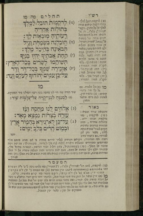 14 (1835) Sefer Tehilim : ʿim Perush Rashi ṿe-targum Ashkenazi me-et Rabenu Mosheh ben Menaḥem n.ʿE., u-veʾur me-et ha-ḥakham ha-mefursam R. Yoʾel Bril asher ḳara be-shem Zemirot Yiśraʾel, ṿe-nilṿeh elaṿ ha-Maʿamar me-et ha-ḥakham ha-medaḳdeḳ mo.h. Ṿolf Meʾir (moreh lashon ʿIvri be-vet ḥinukh ha-normali asher be-Prag), u-ve-tokho nikhlal haʿtaḳah u-veʾur le-khol milot be-laʿaz ha-nimtsaʾot be-Fe. Rashi z.l. / me-et ha-madpis Mosheh ha-Leṿi Landa14 (1835) ספר תהלים / עם פירוש רש״י ותרגום אשכנזי מאת רבינו משה בן מנחם נ״ע, ובאור מאת החכם המפורסם ר' יואל ברי״ל אשר קרא בשם זמירות ישראל, ונלוה אליו המעמר מאת החכם המדקדק מו״ה וואלף מאיר (מורה לשון עברי בבית חנוך הנארמאלי אשר בפראג), ובתוכו נכלל העתקה ובאור לכל מלות בלע״ז הנמצאות בפירש״י ז״ל מאת המדפיס משה הלוי לנדא