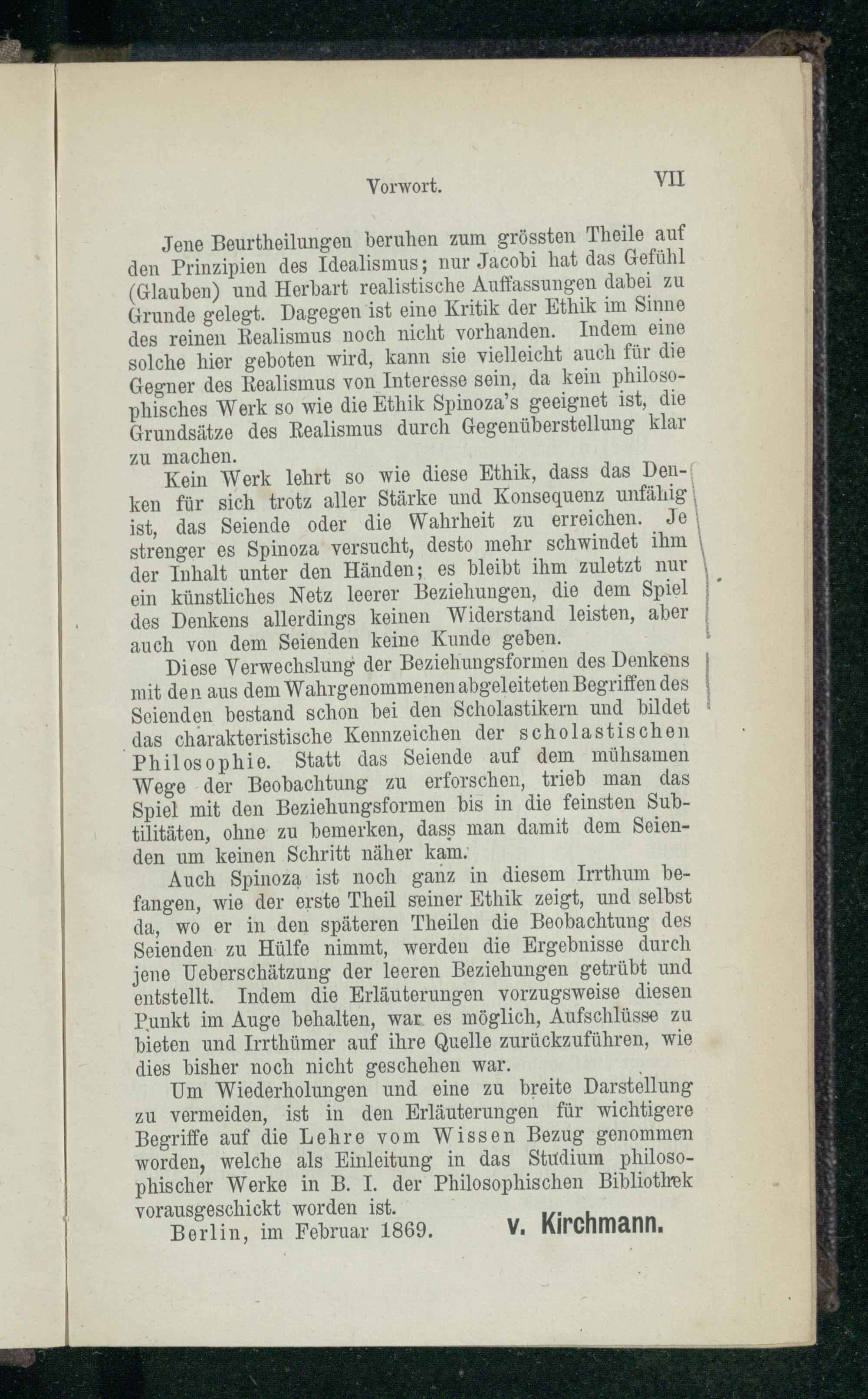 Erläuterungen zu Benedict von Spinoza's Ethik / von J. H. v. Kirchmann