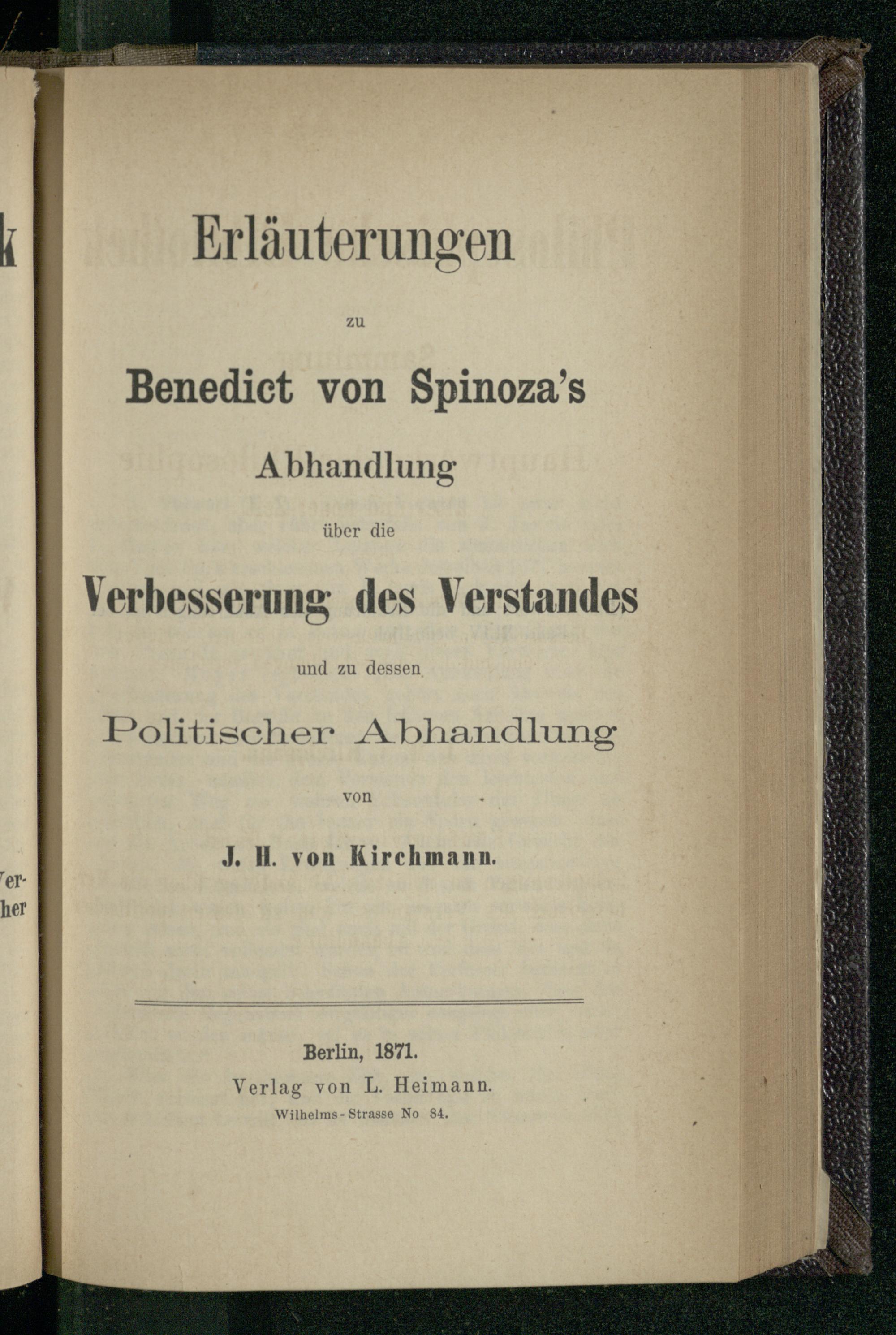Erläuterungen zu Benedict von Spinoza's Abhandlung über die Verbesserung des Verstandes und zu dessen Politischer Abhandlung / von J. H. von Kirchmann