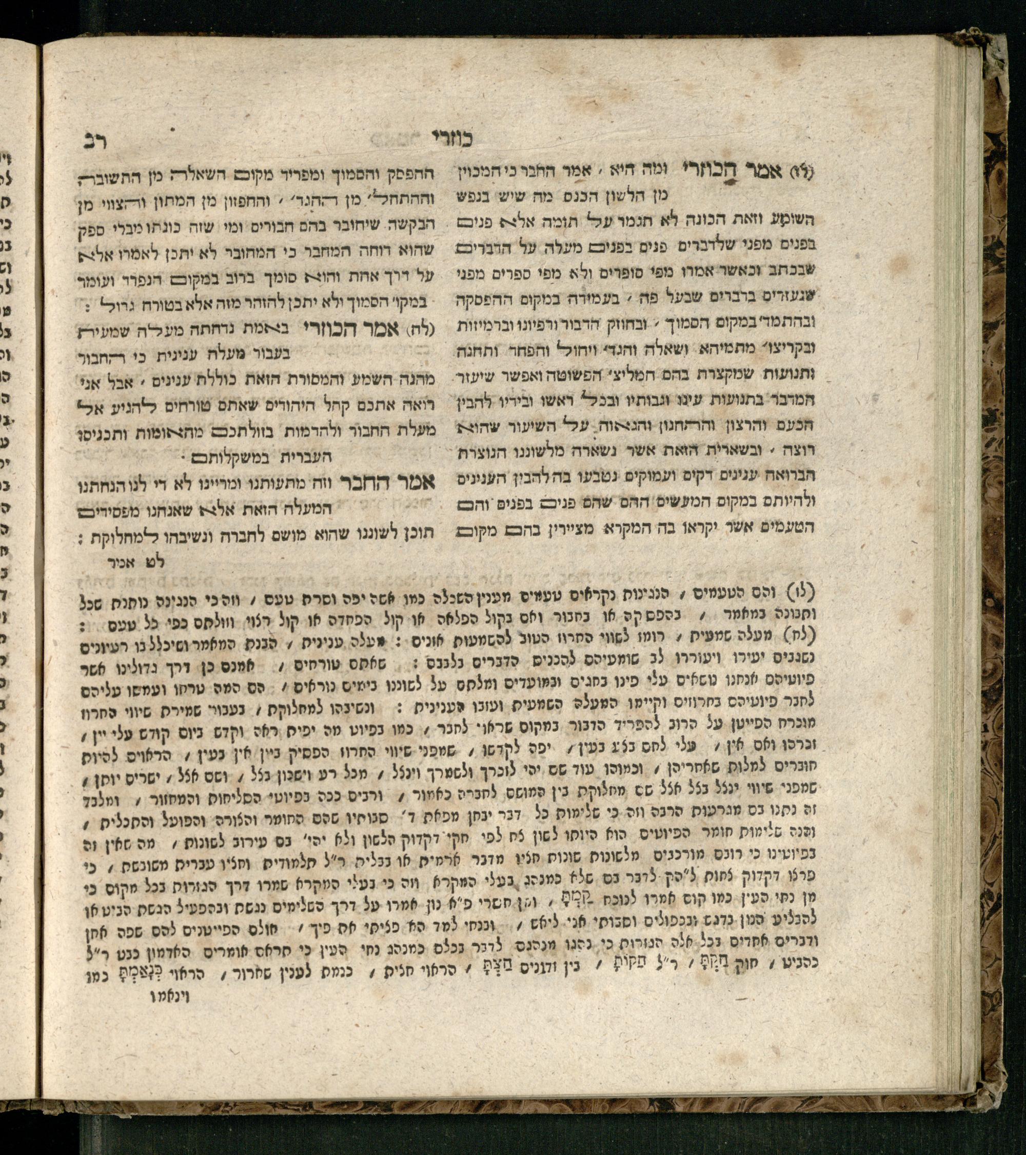 Sefer ha-Kuzari : ha-kolel sipur ha-ṿikuaḥ she-hayah ben ha-melekh shel ʿam medinat Kuzari u-ven he-ḥaver ... / heʿetiḳo he-ḥakham R. Yehudah b.R. Shaʾul ha-Leṿi mi-leshon ʿArav ; meforash ... be-veʾur ḳalספר הכוזרי : הכולל סיפור הוויכוח שהיה בין המלך של עם מדינת כוזרי ובין החבר ... / העתיקו החכם ר׳ יהודה בר׳ שאול הלוי מלשון ערב ; מפורש ... בביאור קל