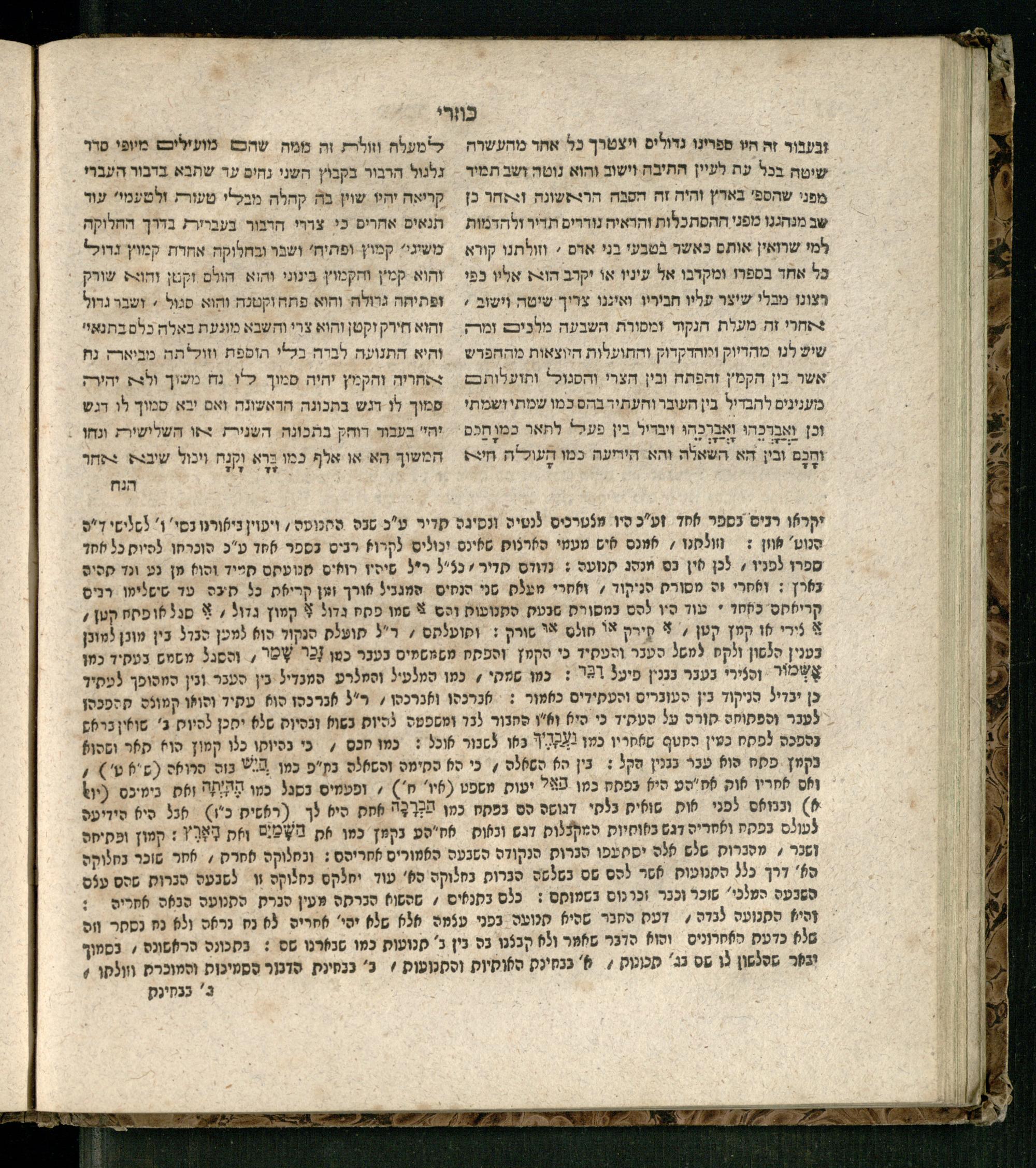 Sefer ha-Kuzari : ha-kolel sipur ha-ṿikuaḥ she-hayah ben ha-melekh shel ʿam medinat Kuzari u-ven he-ḥaver ... / heʿetiḳo he-ḥakham R. Yehudah b.R. Shaʾul ha-Leṿi mi-leshon ʿArav ; meforash ... be-veʾur ḳalספר הכוזרי : הכולל סיפור הוויכוח שהיה בין המלך של עם מדינת כוזרי ובין החבר ... / העתיקו החכם ר׳ יהודה בר׳ שאול הלוי מלשון ערב ; מפורש ... בביאור קל