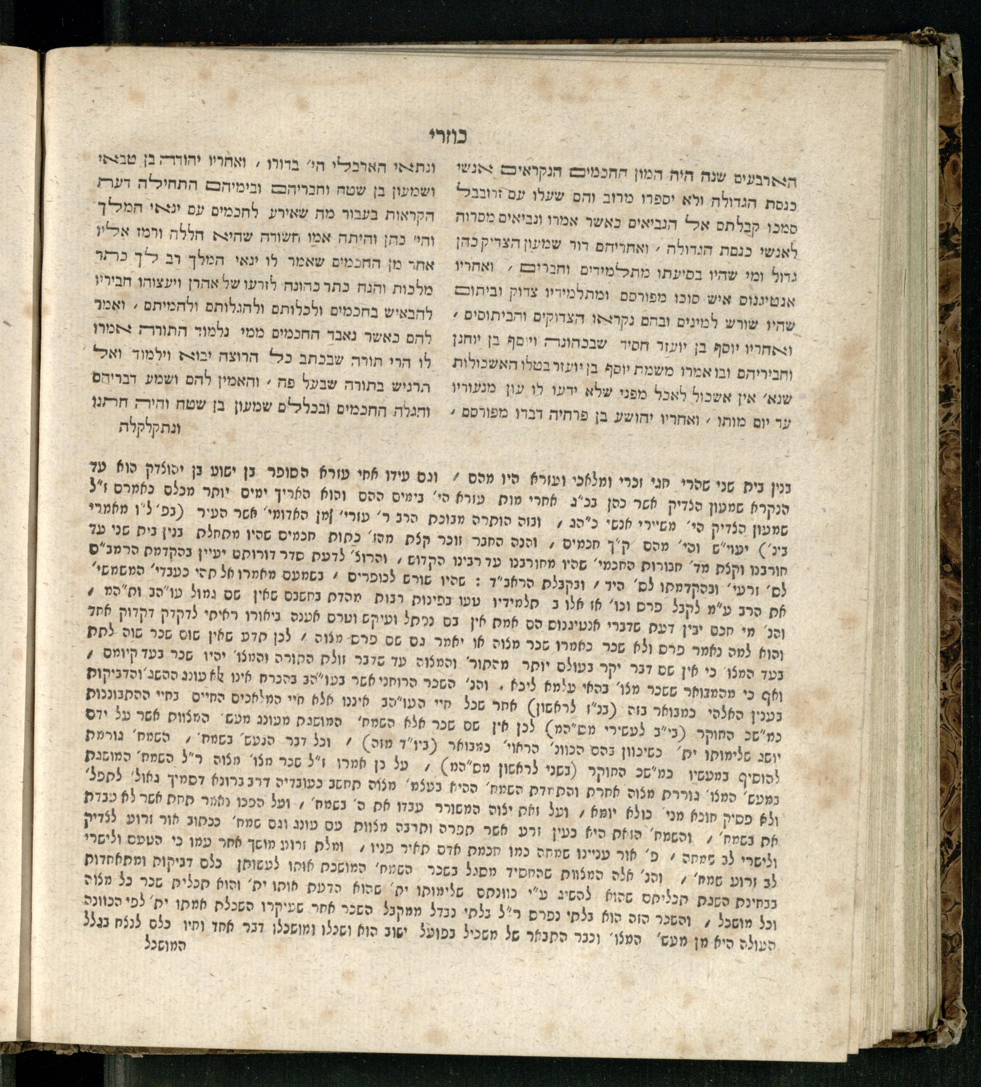 Sefer ha-Kuzari : ha-kolel sipur ha-ṿikuaḥ she-hayah ben ha-melekh shel ʿam medinat Kuzari u-ven he-ḥaver ... / heʿetiḳo he-ḥakham R. Yehudah b.R. Shaʾul ha-Leṿi mi-leshon ʿArav ; meforash ... be-veʾur ḳalספר הכוזרי : הכולל סיפור הוויכוח שהיה בין המלך של עם מדינת כוזרי ובין החבר ... / העתיקו החכם ר׳ יהודה בר׳ שאול הלוי מלשון ערב ; מפורש ... בביאור קל