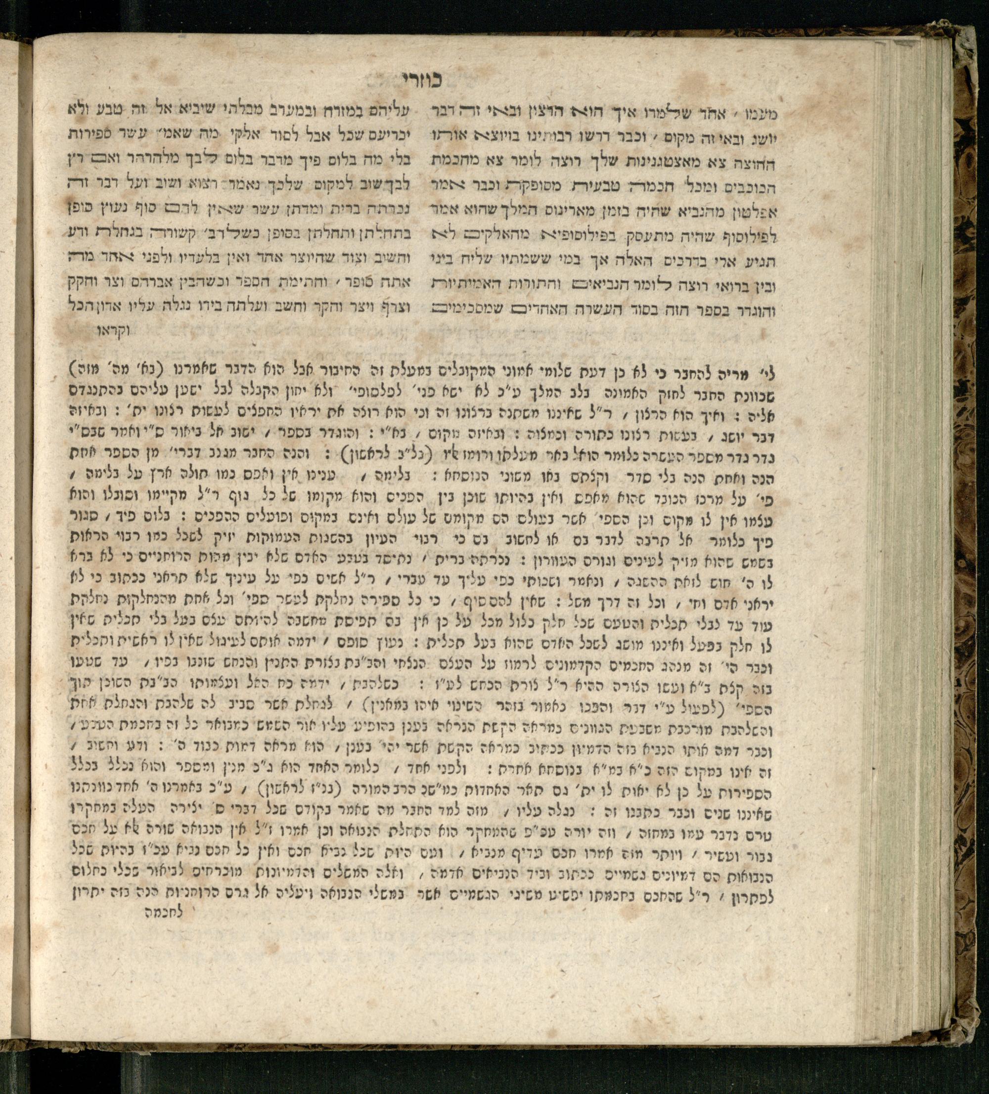 Sefer ha-Kuzari : ha-kolel sipur ha-ṿikuaḥ she-hayah ben ha-melekh shel ʿam medinat Kuzari u-ven he-ḥaver ... / heʿetiḳo he-ḥakham R. Yehudah b.R. Shaʾul ha-Leṿi mi-leshon ʿArav ; meforash ... be-veʾur ḳalספר הכוזרי : הכולל סיפור הוויכוח שהיה בין המלך של עם מדינת כוזרי ובין החבר ... / העתיקו החכם ר׳ יהודה בר׳ שאול הלוי מלשון ערב ; מפורש ... בביאור קל