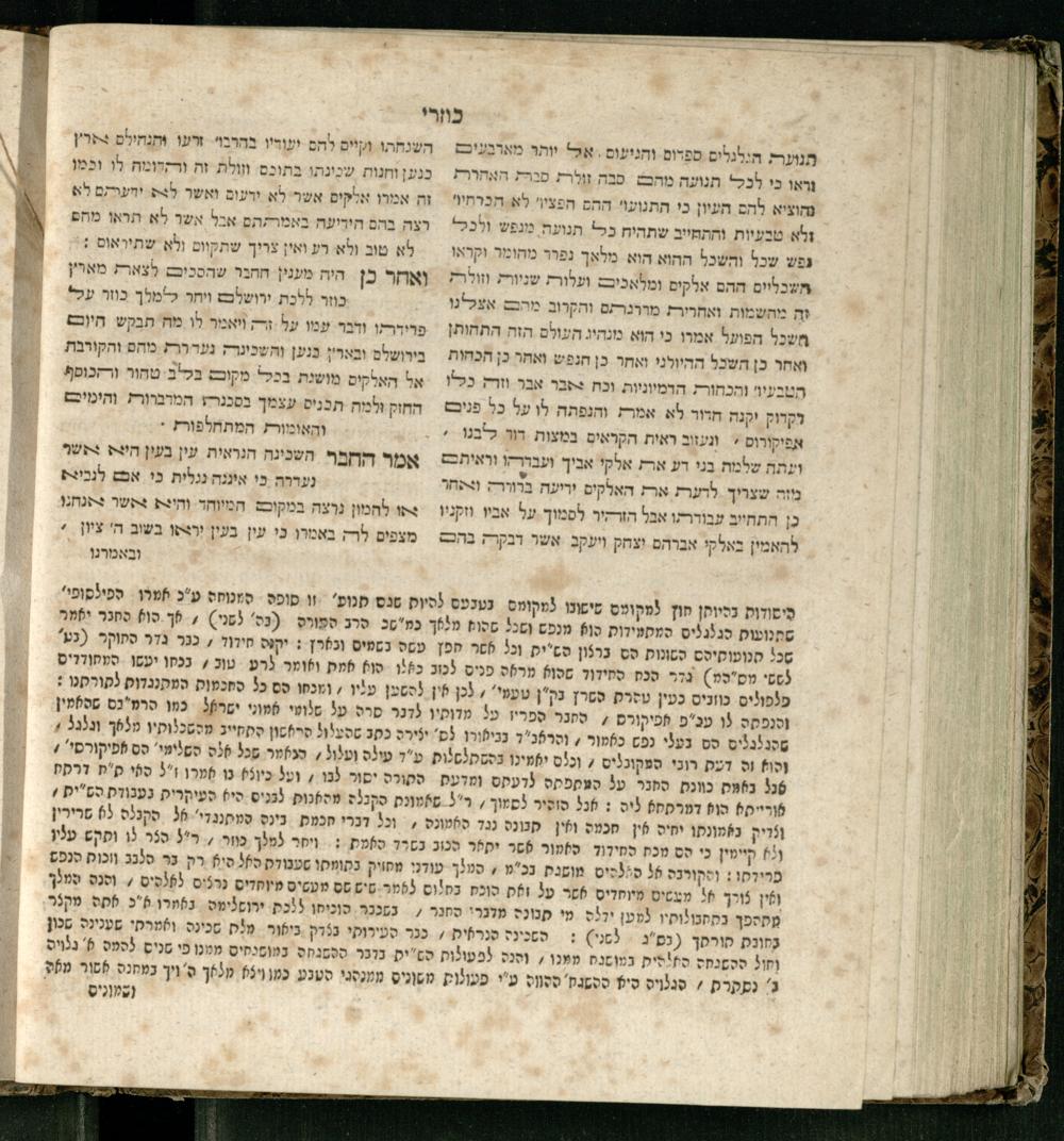 Sefer ha-Kuzari : ha-kolel sipur ha-ṿikuaḥ she-hayah ben ha-melekh shel ʿam medinat Kuzari u-ven he-ḥaver ... / heʿetiḳo he-ḥakham R. Yehudah b.R. Shaʾul ha-Leṿi mi-leshon ʿArav ; meforash ... be-veʾur ḳalספר הכוזרי : הכולל סיפור הוויכוח שהיה בין המלך של עם מדינת כוזרי ובין החבר ... / העתיקו החכם ר׳ יהודה בר׳ שאול הלוי מלשון ערב ; מפורש ... בביאור קל