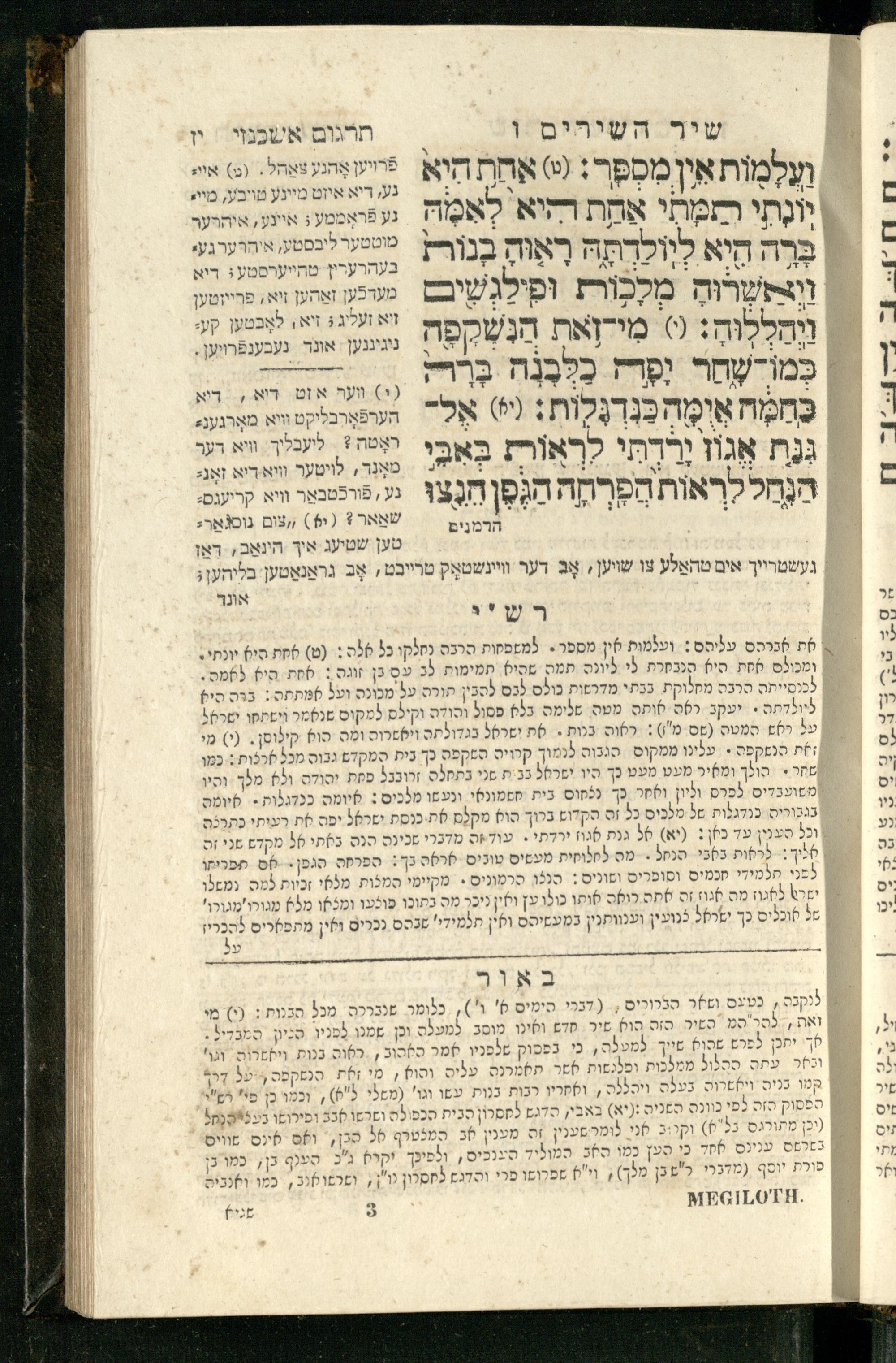 20 (1833) Ḥamesh megilot : ʿim Perush Rashi targum Ashkenazi u-veʾur : hugah bi-sheḳidah rabah u-ve-ʿiyun gadol ṿe-nosaf mavo ha-sheni ʿal megilat Rut, Ekhah, Ḳohelet, ṿe-Ester ; ṿe-ha-meʿamer ʿal kol megilah u-megilah / me-et ha-ḥakham ha-medaḳdeḳ mo.h.r.R. Ṿolf Meʾir (moreh lashon ʿIvri be-vet ḥinukh ha-normali asher be-Prag) ; ṿa-ani ha-madpis hosafti gam targum u-veʾur ʿal milot be-laʿaz ha-nimtsaʾot be-Fe. Rashi z.l.20 (1833) חמש מגילות : עם פירוש רש״י תרגום אשכנזי ובאור : הוגה בשקידה רבה ובעיון גדול ונוסף מבוא השני על מגילת רות, איכה, קהלת, ואסתר; והמעמר על כל מגלה ומגלה / מאת החכם המדקדק מוהר״ר וואלף מאיר (מורה לשון עברי בבית חנוך הנארמאלי אשר בפראג) ; ואני המדפיס הוספתי גם תרגום ובאור על מלות בלע"ז הנמצאות בפירוש״י ז״ל