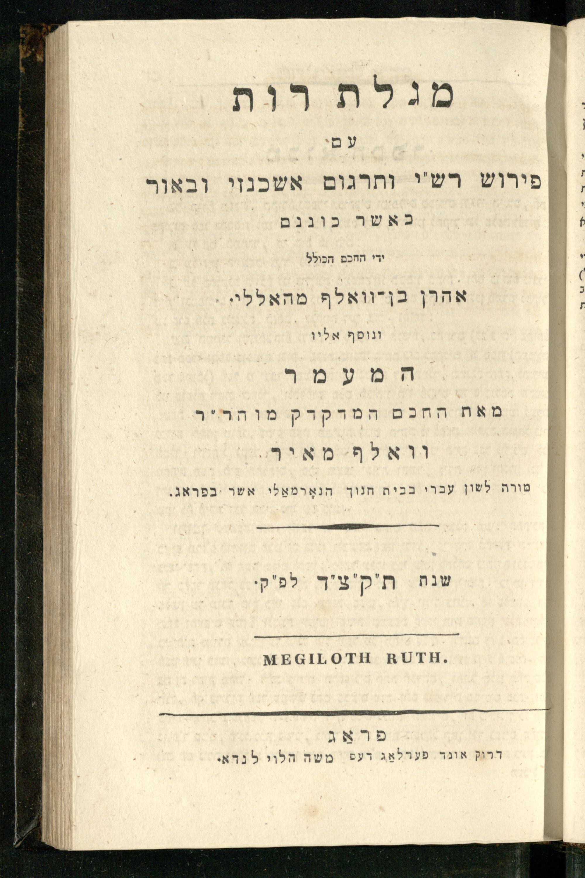 20 (1833) Ḥamesh megilot : ʿim Perush Rashi targum Ashkenazi u-veʾur : hugah bi-sheḳidah rabah u-ve-ʿiyun gadol ṿe-nosaf mavo ha-sheni ʿal megilat Rut, Ekhah, Ḳohelet, ṿe-Ester ; ṿe-ha-meʿamer ʿal kol megilah u-megilah / me-et ha-ḥakham ha-medaḳdeḳ mo.h.r.R. Ṿolf Meʾir (moreh lashon ʿIvri be-vet ḥinukh ha-normali asher be-Prag) ; ṿa-ani ha-madpis hosafti gam targum u-veʾur ʿal milot be-laʿaz ha-nimtsaʾot be-Fe. Rashi z.l.20 (1833) חמש מגילות : עם פירוש רש״י תרגום אשכנזי ובאור : הוגה בשקידה רבה ובעיון גדול ונוסף מבוא השני על מגילת רות, איכה, קהלת, ואסתר; והמעמר על כל מגלה ומגלה / מאת החכם המדקדק מוהר״ר וואלף מאיר (מורה לשון עברי בבית חנוך הנארמאלי אשר בפראג) ; ואני המדפיס הוספתי גם תרגום ובאור על מלות בלע"ז הנמצאות בפירוש״י ז״ל