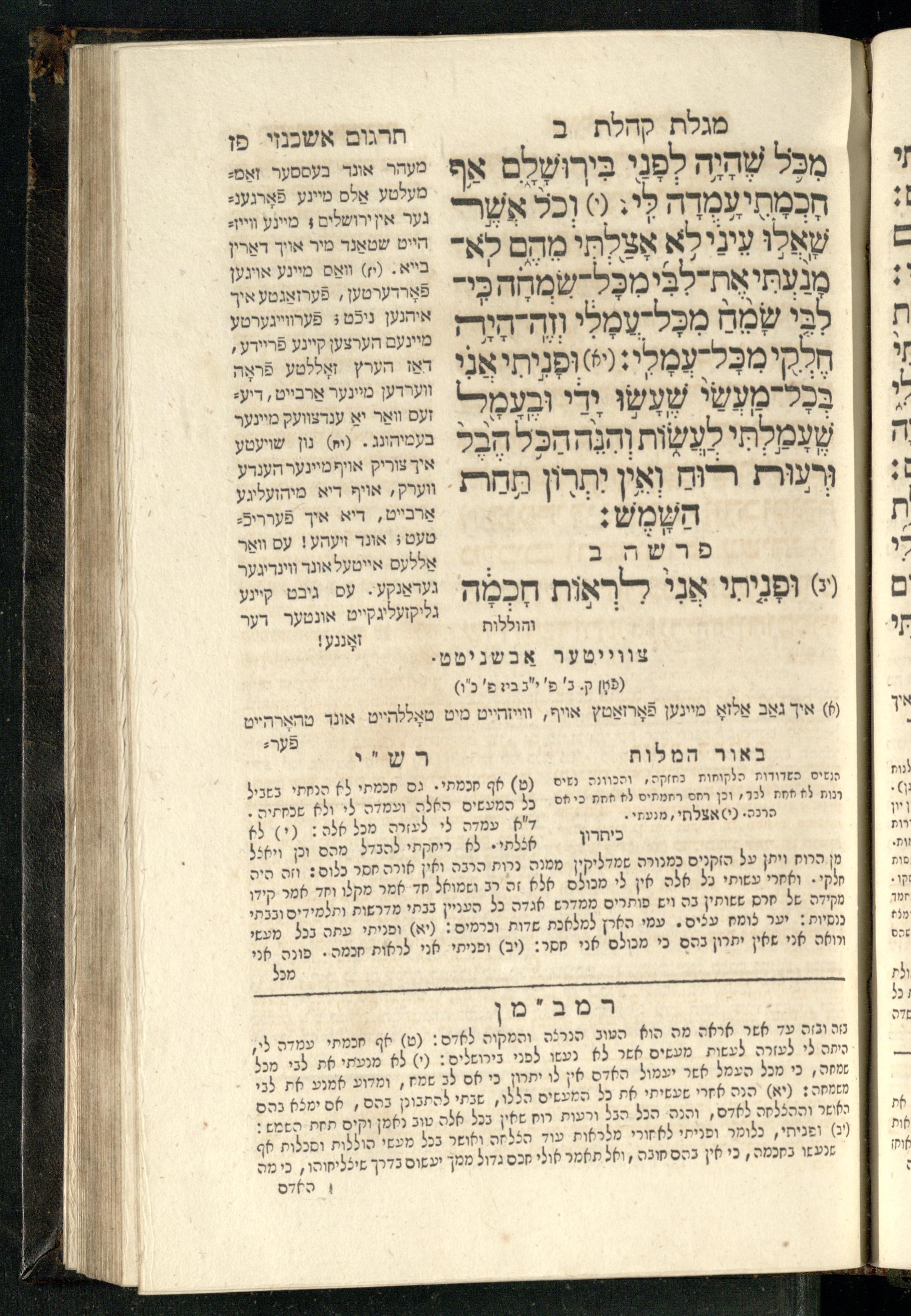 20 (1833) Ḥamesh megilot : ʿim Perush Rashi targum Ashkenazi u-veʾur : hugah bi-sheḳidah rabah u-ve-ʿiyun gadol ṿe-nosaf mavo ha-sheni ʿal megilat Rut, Ekhah, Ḳohelet, ṿe-Ester ; ṿe-ha-meʿamer ʿal kol megilah u-megilah / me-et ha-ḥakham ha-medaḳdeḳ mo.h.r.R. Ṿolf Meʾir (moreh lashon ʿIvri be-vet ḥinukh ha-normali asher be-Prag) ; ṿa-ani ha-madpis hosafti gam targum u-veʾur ʿal milot be-laʿaz ha-nimtsaʾot be-Fe. Rashi z.l.20 (1833) חמש מגילות : עם פירוש רש״י תרגום אשכנזי ובאור : הוגה בשקידה רבה ובעיון גדול ונוסף מבוא השני על מגילת רות, איכה, קהלת, ואסתר; והמעמר על כל מגלה ומגלה / מאת החכם המדקדק מוהר״ר וואלף מאיר (מורה לשון עברי בבית חנוך הנארמאלי אשר בפראג) ; ואני המדפיס הוספתי גם תרגום ובאור על מלות בלע"ז הנמצאות בפירוש״י ז״ל
