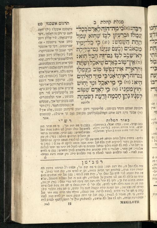 20 (1833) Ḥamesh megilot : ʿim Perush Rashi targum Ashkenazi u-veʾur : hugah bi-sheḳidah rabah u-ve-ʿiyun gadol ṿe-nosaf mavo ha-sheni ʿal megilat Rut, Ekhah, Ḳohelet, ṿe-Ester ; ṿe-ha-meʿamer ʿal kol megilah u-megilah / me-et ha-ḥakham ha-medaḳdeḳ mo.h.r.R. Ṿolf Meʾir (moreh lashon ʿIvri be-vet ḥinukh ha-normali asher be-Prag) ; ṿa-ani ha-madpis hosafti gam targum u-veʾur ʿal milot be-laʿaz ha-nimtsaʾot be-Fe. Rashi z.l.20 (1833) חמש מגילות : עם פירוש רש״י תרגום אשכנזי ובאור : הוגה בשקידה רבה ובעיון גדול ונוסף מבוא השני על מגילת רות, איכה, קהלת, ואסתר; והמעמר על כל מגלה ומגלה / מאת החכם המדקדק מוהר״ר וואלף מאיר (מורה לשון עברי בבית חנוך הנארמאלי אשר בפראג) ; ואני המדפיס הוספתי גם תרגום ובאור על מלות בלע"ז הנמצאות בפירוש״י ז״ל