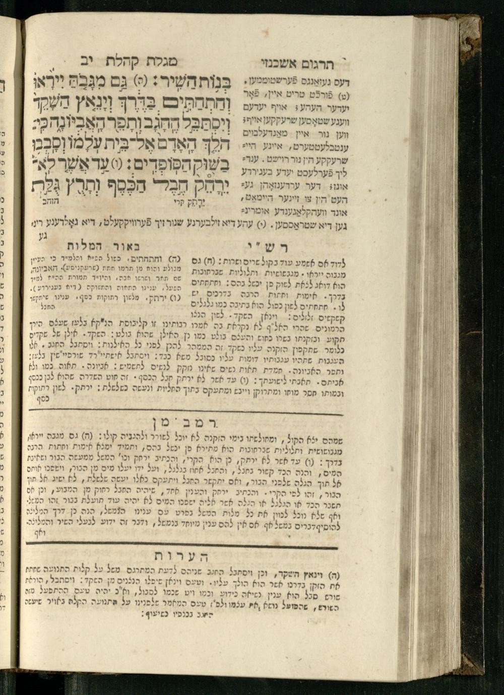 20 (1833) Ḥamesh megilot : ʿim Perush Rashi targum Ashkenazi u-veʾur : hugah bi-sheḳidah rabah u-ve-ʿiyun gadol ṿe-nosaf mavo ha-sheni ʿal megilat Rut, Ekhah, Ḳohelet, ṿe-Ester ; ṿe-ha-meʿamer ʿal kol megilah u-megilah / me-et ha-ḥakham ha-medaḳdeḳ mo.h.r.R. Ṿolf Meʾir (moreh lashon ʿIvri be-vet ḥinukh ha-normali asher be-Prag) ; ṿa-ani ha-madpis hosafti gam targum u-veʾur ʿal milot be-laʿaz ha-nimtsaʾot be-Fe. Rashi z.l.20 (1833) חמש מגילות : עם פירוש רש״י תרגום אשכנזי ובאור : הוגה בשקידה רבה ובעיון גדול ונוסף מבוא השני על מגילת רות, איכה, קהלת, ואסתר; והמעמר על כל מגלה ומגלה / מאת החכם המדקדק מוהר״ר וואלף מאיר (מורה לשון עברי בבית חנוך הנארמאלי אשר בפראג) ; ואני המדפיס הוספתי גם תרגום ובאור על מלות בלע"ז הנמצאות בפירוש״י ז״ל