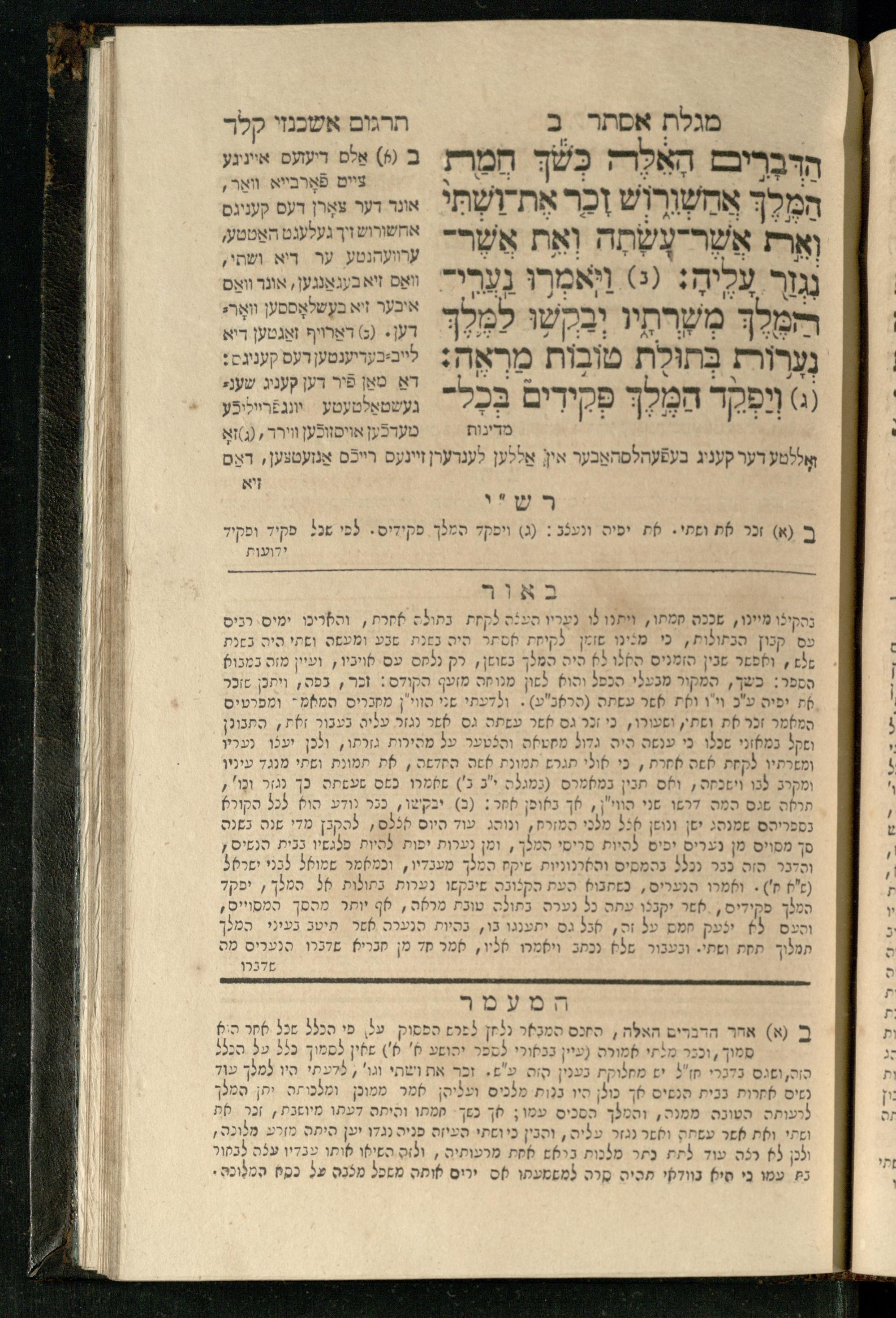 20 (1833) Ḥamesh megilot : ʿim Perush Rashi targum Ashkenazi u-veʾur : hugah bi-sheḳidah rabah u-ve-ʿiyun gadol ṿe-nosaf mavo ha-sheni ʿal megilat Rut, Ekhah, Ḳohelet, ṿe-Ester ; ṿe-ha-meʿamer ʿal kol megilah u-megilah / me-et ha-ḥakham ha-medaḳdeḳ mo.h.r.R. Ṿolf Meʾir (moreh lashon ʿIvri be-vet ḥinukh ha-normali asher be-Prag) ; ṿa-ani ha-madpis hosafti gam targum u-veʾur ʿal milot be-laʿaz ha-nimtsaʾot be-Fe. Rashi z.l.20 (1833) חמש מגילות : עם פירוש רש״י תרגום אשכנזי ובאור : הוגה בשקידה רבה ובעיון גדול ונוסף מבוא השני על מגילת רות, איכה, קהלת, ואסתר; והמעמר על כל מגלה ומגלה / מאת החכם המדקדק מוהר״ר וואלף מאיר (מורה לשון עברי בבית חנוך הנארמאלי אשר בפראג) ; ואני המדפיס הוספתי גם תרגום ובאור על מלות בלע"ז הנמצאות בפירוש״י ז״ל
