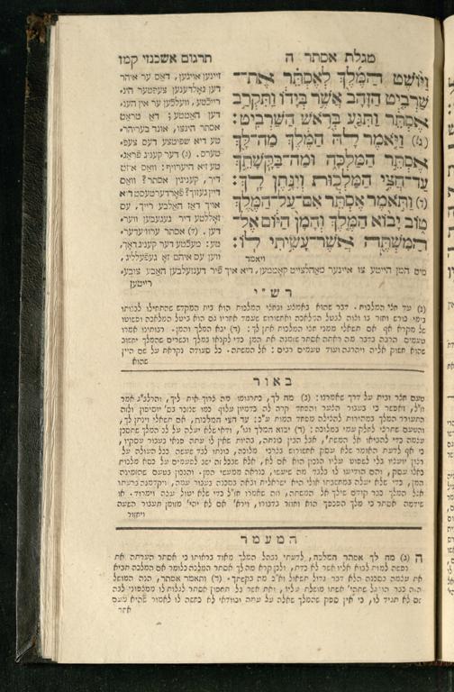 20 (1833) Ḥamesh megilot : ʿim Perush Rashi targum Ashkenazi u-veʾur : hugah bi-sheḳidah rabah u-ve-ʿiyun gadol ṿe-nosaf mavo ha-sheni ʿal megilat Rut, Ekhah, Ḳohelet, ṿe-Ester ; ṿe-ha-meʿamer ʿal kol megilah u-megilah / me-et ha-ḥakham ha-medaḳdeḳ mo.h.r.R. Ṿolf Meʾir (moreh lashon ʿIvri be-vet ḥinukh ha-normali asher be-Prag) ; ṿa-ani ha-madpis hosafti gam targum u-veʾur ʿal milot be-laʿaz ha-nimtsaʾot be-Fe. Rashi z.l.20 (1833) חמש מגילות : עם פירוש רש״י תרגום אשכנזי ובאור : הוגה בשקידה רבה ובעיון גדול ונוסף מבוא השני על מגילת רות, איכה, קהלת, ואסתר; והמעמר על כל מגלה ומגלה / מאת החכם המדקדק מוהר״ר וואלף מאיר (מורה לשון עברי בבית חנוך הנארמאלי אשר בפראג) ; ואני המדפיס הוספתי גם תרגום ובאור על מלות בלע"ז הנמצאות בפירוש״י ז״ל