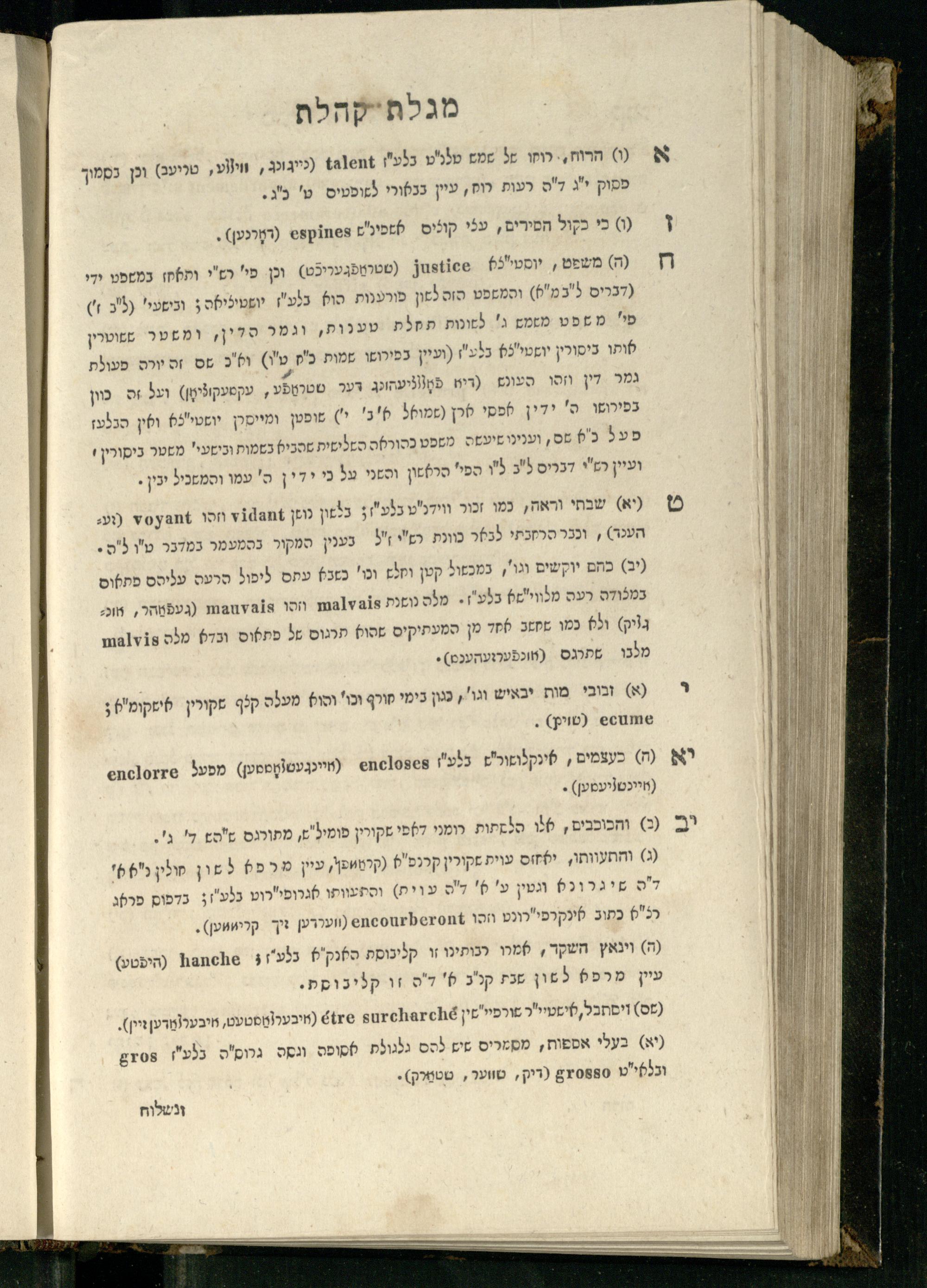 20 (1833) Ḥamesh megilot : ʿim Perush Rashi targum Ashkenazi u-veʾur : hugah bi-sheḳidah rabah u-ve-ʿiyun gadol ṿe-nosaf mavo ha-sheni ʿal megilat Rut, Ekhah, Ḳohelet, ṿe-Ester ; ṿe-ha-meʿamer ʿal kol megilah u-megilah / me-et ha-ḥakham ha-medaḳdeḳ mo.h.r.R. Ṿolf Meʾir (moreh lashon ʿIvri be-vet ḥinukh ha-normali asher be-Prag) ; ṿa-ani ha-madpis hosafti gam targum u-veʾur ʿal milot be-laʿaz ha-nimtsaʾot be-Fe. Rashi z.l.20 (1833) חמש מגילות : עם פירוש רש״י תרגום אשכנזי ובאור : הוגה בשקידה רבה ובעיון גדול ונוסף מבוא השני על מגילת רות, איכה, קהלת, ואסתר; והמעמר על כל מגלה ומגלה / מאת החכם המדקדק מוהר״ר וואלף מאיר (מורה לשון עברי בבית חנוך הנארמאלי אשר בפראג) ; ואני המדפיס הוספתי גם תרגום ובאור על מלות בלע"ז הנמצאות בפירוש״י ז״ל