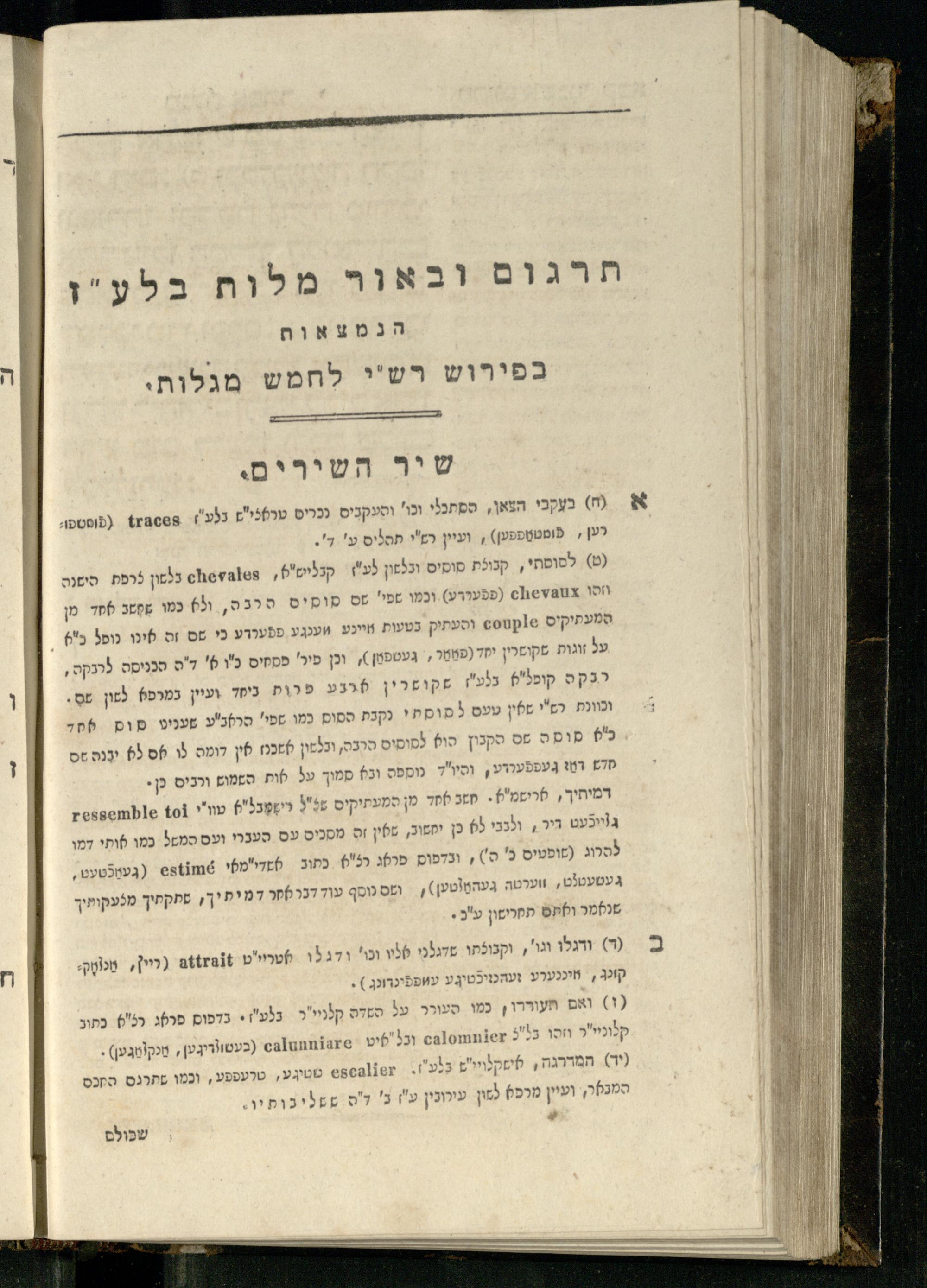 20 (1833) Ḥamesh megilot : ʿim Perush Rashi targum Ashkenazi u-veʾur : hugah bi-sheḳidah rabah u-ve-ʿiyun gadol ṿe-nosaf mavo ha-sheni ʿal megilat Rut, Ekhah, Ḳohelet, ṿe-Ester ; ṿe-ha-meʿamer ʿal kol megilah u-megilah / me-et ha-ḥakham ha-medaḳdeḳ mo.h.r.R. Ṿolf Meʾir (moreh lashon ʿIvri be-vet ḥinukh ha-normali asher be-Prag) ; ṿa-ani ha-madpis hosafti gam targum u-veʾur ʿal milot be-laʿaz ha-nimtsaʾot be-Fe. Rashi z.l.20 (1833) חמש מגילות : עם פירוש רש״י תרגום אשכנזי ובאור : הוגה בשקידה רבה ובעיון גדול ונוסף מבוא השני על מגילת רות, איכה, קהלת, ואסתר; והמעמר על כל מגלה ומגלה / מאת החכם המדקדק מוהר״ר וואלף מאיר (מורה לשון עברי בבית חנוך הנארמאלי אשר בפראג) ; ואני המדפיס הוספתי גם תרגום ובאור על מלות בלע"ז הנמצאות בפירוש״י ז״ל