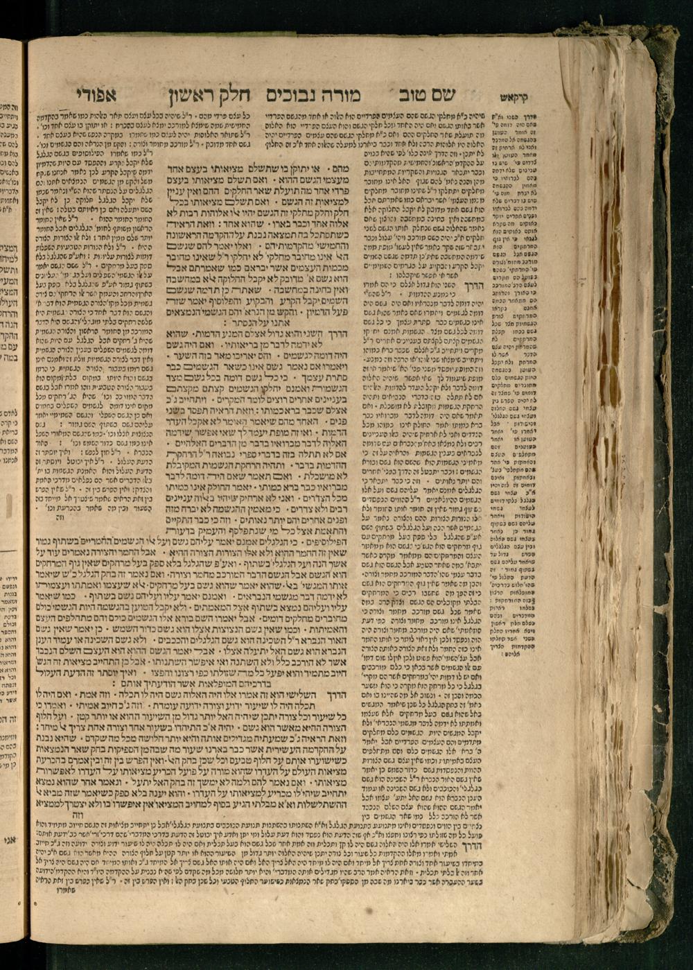 Moreh nevukhim = Doctor Perplexorum / le-ha-maʾor ha-gadol gaʾon Yiśraʾel ha-rav rabenu Mosheh bar Maimon ... u-perusho ... Shem Ṭov u-perush Efodi ... ṿe-hosafnu ... perush ... n. [Ibn] Ḳreśḳaś ... gam kaṿanat kol pereḳ ... ʿal daʿat ... he-Ḥarizi gam perush Milot zarot le-Ibn Tibon ... gam pesuḳe ha-Torah u-neviʾim u-ketuvim ... ʿal sidram ... hosafnu ʿal ha-rishonim le-hatsiv simanim ben maʾamarim she-be-moreh ...מורה נבוכים / להמאור הגדול גאון ישראל הרב רבינו משה בר מימון ... ופירושו שם טוב ופירוש אפודי ... והוספנו ... פירוש ן. [אבן] קרשקש ... גם כוונת כל פרק ... על דעת ... החריזי גם פירוש מלות זרות לאבן תבון ... גם פסוקי התורה ונביאים וכתובים ... על סדרם ... הוספנו על הראשונים להציב סימנים בין מאמרים שבמורה ...
