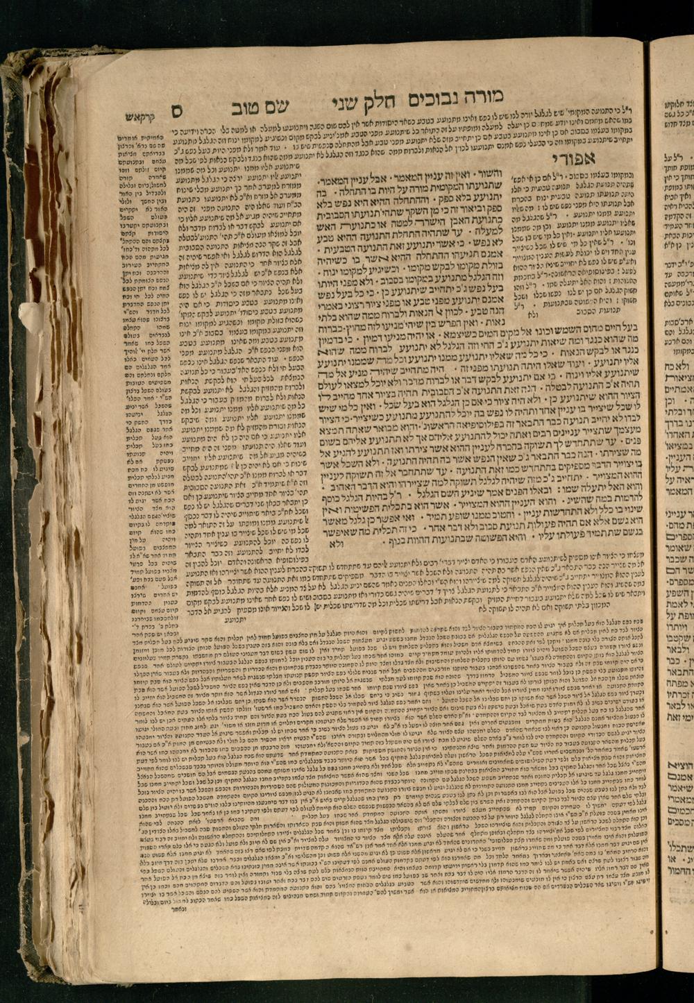Moreh nevukhim = Doctor Perplexorum / le-ha-maʾor ha-gadol gaʾon Yiśraʾel ha-rav rabenu Mosheh bar Maimon ... u-perusho ... Shem Ṭov u-perush Efodi ... ṿe-hosafnu ... perush ... n. [Ibn] Ḳreśḳaś ... gam kaṿanat kol pereḳ ... ʿal daʿat ... he-Ḥarizi gam perush Milot zarot le-Ibn Tibon ... gam pesuḳe ha-Torah u-neviʾim u-ketuvim ... ʿal sidram ... hosafnu ʿal ha-rishonim le-hatsiv simanim ben maʾamarim she-be-moreh ...מורה נבוכים / להמאור הגדול גאון ישראל הרב רבינו משה בר מימון ... ופירושו שם טוב ופירוש אפודי ... והוספנו ... פירוש ן. [אבן] קרשקש ... גם כוונת כל פרק ... על דעת ... החריזי גם פירוש מלות זרות לאבן תבון ... גם פסוקי התורה ונביאים וכתובים ... על סדרם ... הוספנו על הראשונים להציב סימנים בין מאמרים שבמורה ...