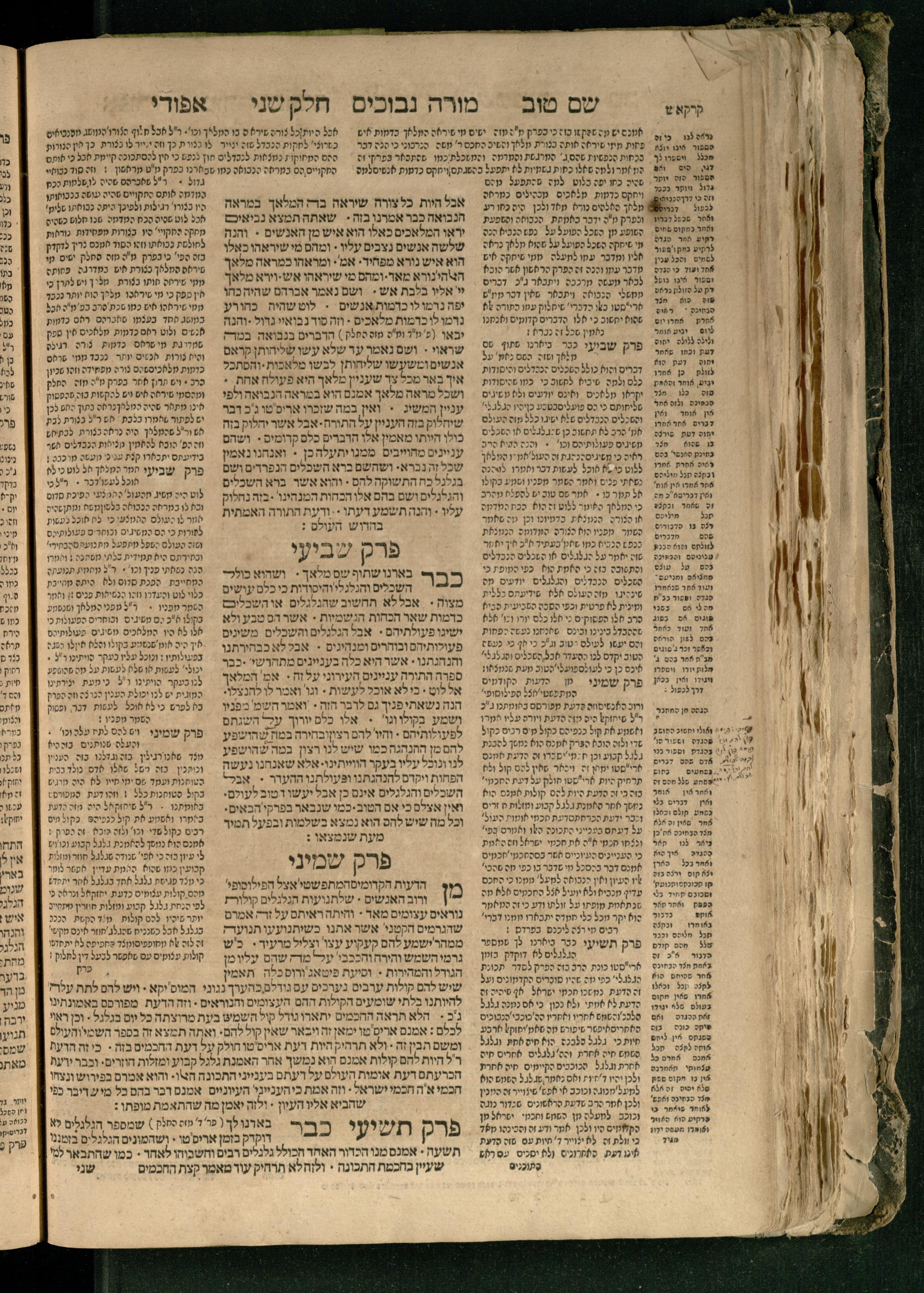 Moreh nevukhim = Doctor Perplexorum / le-ha-maʾor ha-gadol gaʾon Yiśraʾel ha-rav rabenu Mosheh bar Maimon ... u-perusho ... Shem Ṭov u-perush Efodi ... ṿe-hosafnu ... perush ... n. [Ibn] Ḳreśḳaś ... gam kaṿanat kol pereḳ ... ʿal daʿat ... he-Ḥarizi gam perush Milot zarot le-Ibn Tibon ... gam pesuḳe ha-Torah u-neviʾim u-ketuvim ... ʿal sidram ... hosafnu ʿal ha-rishonim le-hatsiv simanim ben maʾamarim she-be-moreh ...מורה נבוכים / להמאור הגדול גאון ישראל הרב רבינו משה בר מימון ... ופירושו שם טוב ופירוש אפודי ... והוספנו ... פירוש ן. [אבן] קרשקש ... גם כוונת כל פרק ... על דעת ... החריזי גם פירוש מלות זרות לאבן תבון ... גם פסוקי התורה ונביאים וכתובים ... על סדרם ... הוספנו על הראשונים להציב סימנים בין מאמרים שבמורה ...