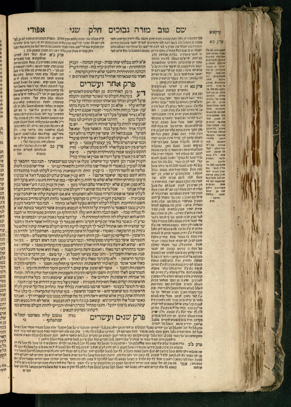 Moreh nevukhim = Doctor Perplexorum / le-ha-maʾor ha-gadol gaʾon Yiśraʾel ha-rav rabenu Mosheh bar Maimon ... u-perusho ... Shem Ṭov u-perush Efodi ... ṿe-hosafnu ... perush ... n. [Ibn] Ḳreśḳaś ... gam kaṿanat kol pereḳ ... ʿal daʿat ... he-Ḥarizi gam perush Milot zarot le-Ibn Tibon ... gam pesuḳe ha-Torah u-neviʾim u-ketuvim ... ʿal sidram ... hosafnu ʿal ha-rishonim le-hatsiv simanim ben maʾamarim she-be-moreh ...מורה נבוכים / להמאור הגדול גאון ישראל הרב רבינו משה בר מימון ... ופירושו שם טוב ופירוש אפודי ... והוספנו ... פירוש ן. [אבן] קרשקש ... גם כוונת כל פרק ... על דעת ... החריזי גם פירוש מלות זרות לאבן תבון ... גם פסוקי התורה ונביאים וכתובים ... על סדרם ... הוספנו על הראשונים להציב סימנים בין מאמרים שבמורה ...