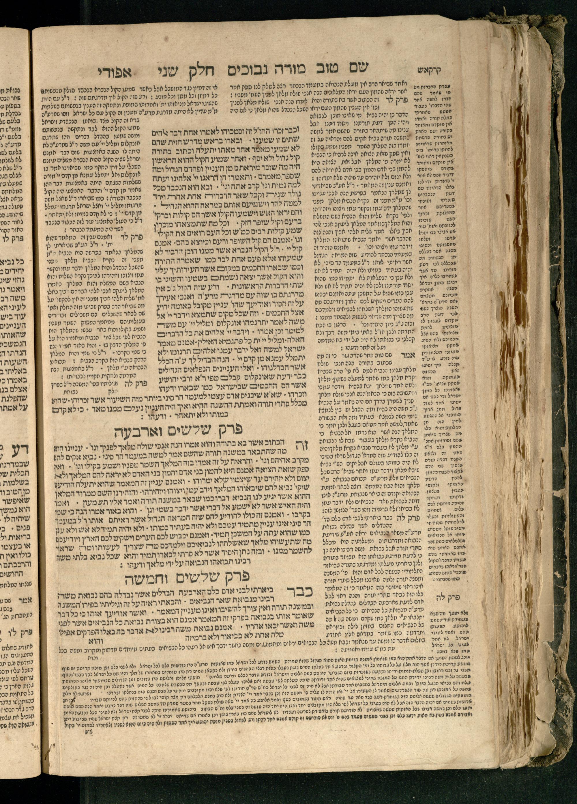 Moreh nevukhim = Doctor Perplexorum / le-ha-maʾor ha-gadol gaʾon Yiśraʾel ha-rav rabenu Mosheh bar Maimon ... u-perusho ... Shem Ṭov u-perush Efodi ... ṿe-hosafnu ... perush ... n. [Ibn] Ḳreśḳaś ... gam kaṿanat kol pereḳ ... ʿal daʿat ... he-Ḥarizi gam perush Milot zarot le-Ibn Tibon ... gam pesuḳe ha-Torah u-neviʾim u-ketuvim ... ʿal sidram ... hosafnu ʿal ha-rishonim le-hatsiv simanim ben maʾamarim she-be-moreh ...מורה נבוכים / להמאור הגדול גאון ישראל הרב רבינו משה בר מימון ... ופירושו שם טוב ופירוש אפודי ... והוספנו ... פירוש ן. [אבן] קרשקש ... גם כוונת כל פרק ... על דעת ... החריזי גם פירוש מלות זרות לאבן תבון ... גם פסוקי התורה ונביאים וכתובים ... על סדרם ... הוספנו על הראשונים להציב סימנים בין מאמרים שבמורה ...