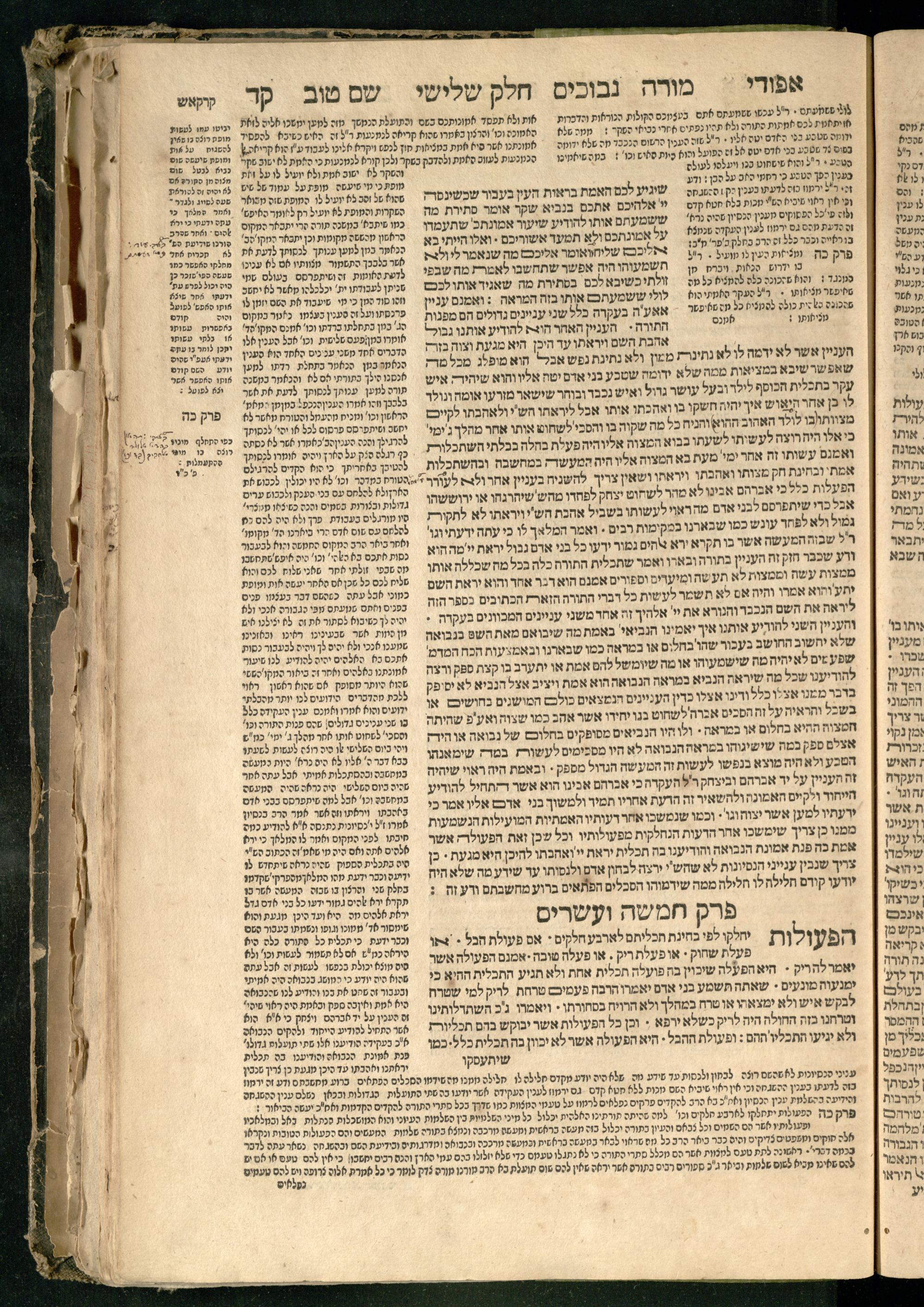 Moreh nevukhim = Doctor Perplexorum / le-ha-maʾor ha-gadol gaʾon Yiśraʾel ha-rav rabenu Mosheh bar Maimon ... u-perusho ... Shem Ṭov u-perush Efodi ... ṿe-hosafnu ... perush ... n. [Ibn] Ḳreśḳaś ... gam kaṿanat kol pereḳ ... ʿal daʿat ... he-Ḥarizi gam perush Milot zarot le-Ibn Tibon ... gam pesuḳe ha-Torah u-neviʾim u-ketuvim ... ʿal sidram ... hosafnu ʿal ha-rishonim le-hatsiv simanim ben maʾamarim she-be-moreh ...מורה נבוכים / להמאור הגדול גאון ישראל הרב רבינו משה בר מימון ... ופירושו שם טוב ופירוש אפודי ... והוספנו ... פירוש ן. [אבן] קרשקש ... גם כוונת כל פרק ... על דעת ... החריזי גם פירוש מלות זרות לאבן תבון ... גם פסוקי התורה ונביאים וכתובים ... על סדרם ... הוספנו על הראשונים להציב סימנים בין מאמרים שבמורה ...