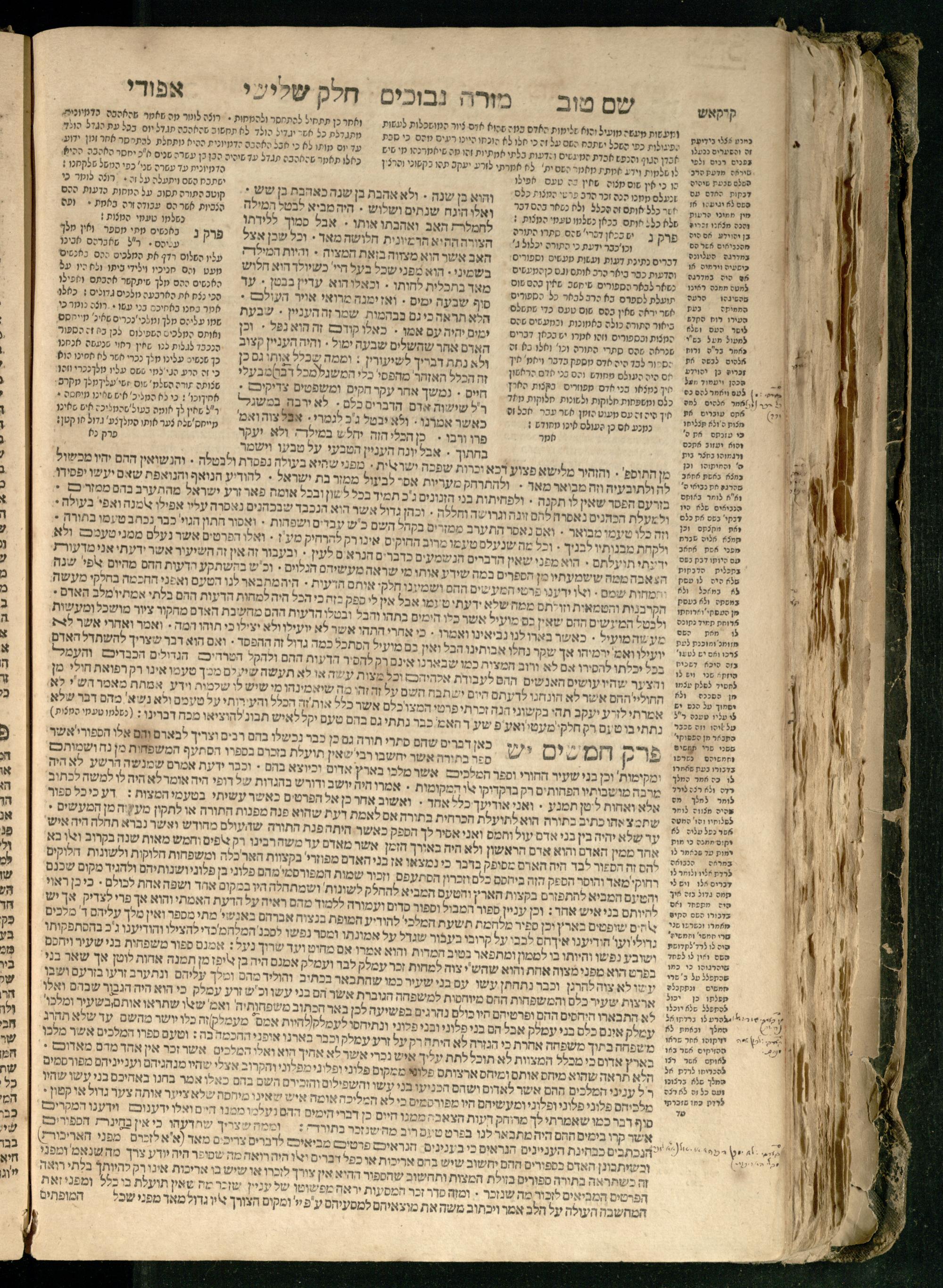Moreh nevukhim = Doctor Perplexorum / le-ha-maʾor ha-gadol gaʾon Yiśraʾel ha-rav rabenu Mosheh bar Maimon ... u-perusho ... Shem Ṭov u-perush Efodi ... ṿe-hosafnu ... perush ... n. [Ibn] Ḳreśḳaś ... gam kaṿanat kol pereḳ ... ʿal daʿat ... he-Ḥarizi gam perush Milot zarot le-Ibn Tibon ... gam pesuḳe ha-Torah u-neviʾim u-ketuvim ... ʿal sidram ... hosafnu ʿal ha-rishonim le-hatsiv simanim ben maʾamarim she-be-moreh ...מורה נבוכים / להמאור הגדול גאון ישראל הרב רבינו משה בר מימון ... ופירושו שם טוב ופירוש אפודי ... והוספנו ... פירוש ן. [אבן] קרשקש ... גם כוונת כל פרק ... על דעת ... החריזי גם פירוש מלות זרות לאבן תבון ... גם פסוקי התורה ונביאים וכתובים ... על סדרם ... הוספנו על הראשונים להציב סימנים בין מאמרים שבמורה ...