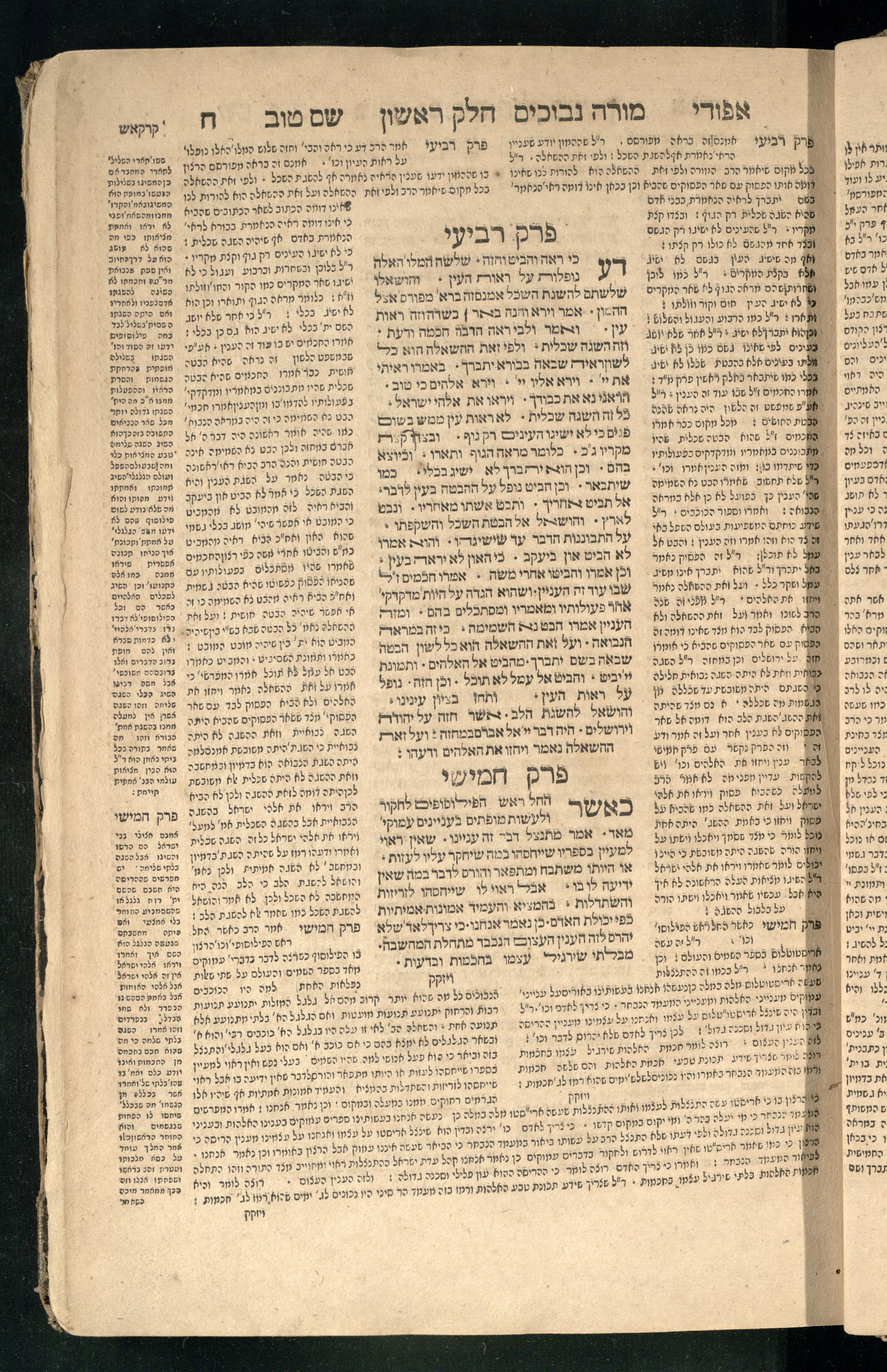 Moreh nevukhim = Doctor Perplexorum / le-ha-maʾor ha-gadol gaʾon Yiśraʾel ha-rav rabenu Mosheh bar Maimon ... u-perusho ... Shem Ṭov u-perush Efodi ... ṿe-hosafnu ... perush ... n. [Ibn] Ḳreśḳaś ... gam kaṿanat kol pereḳ ... ʿal daʿat ... he-Ḥarizi gam perush Milot zarot le-Ibn Tibon ... gam pesuḳe ha-Torah u-neviʾim u-ketuvim ... ʿal sidram ... hosafnu ʿal ha-rishonim le-hatsiv simanim ben maʾamarim she-be-moreh ...מורה נבוכים / להמאור הגדול גאון ישראל הרב רבינו משה בר מימון ... ופירושו שם טוב ופירוש אפודי ... והוספנו ... פירוש ן. [אבן] קרשקש ... גם כוונת כל פרק ... על דעת ... החריזי גם פירוש מלות זרות לאבן תבון ... גם פסוקי התורה ונביאים וכתובים ... על סדרם ... הוספנו על הראשונים להציב סימנים בין מאמרים שבמורה ...