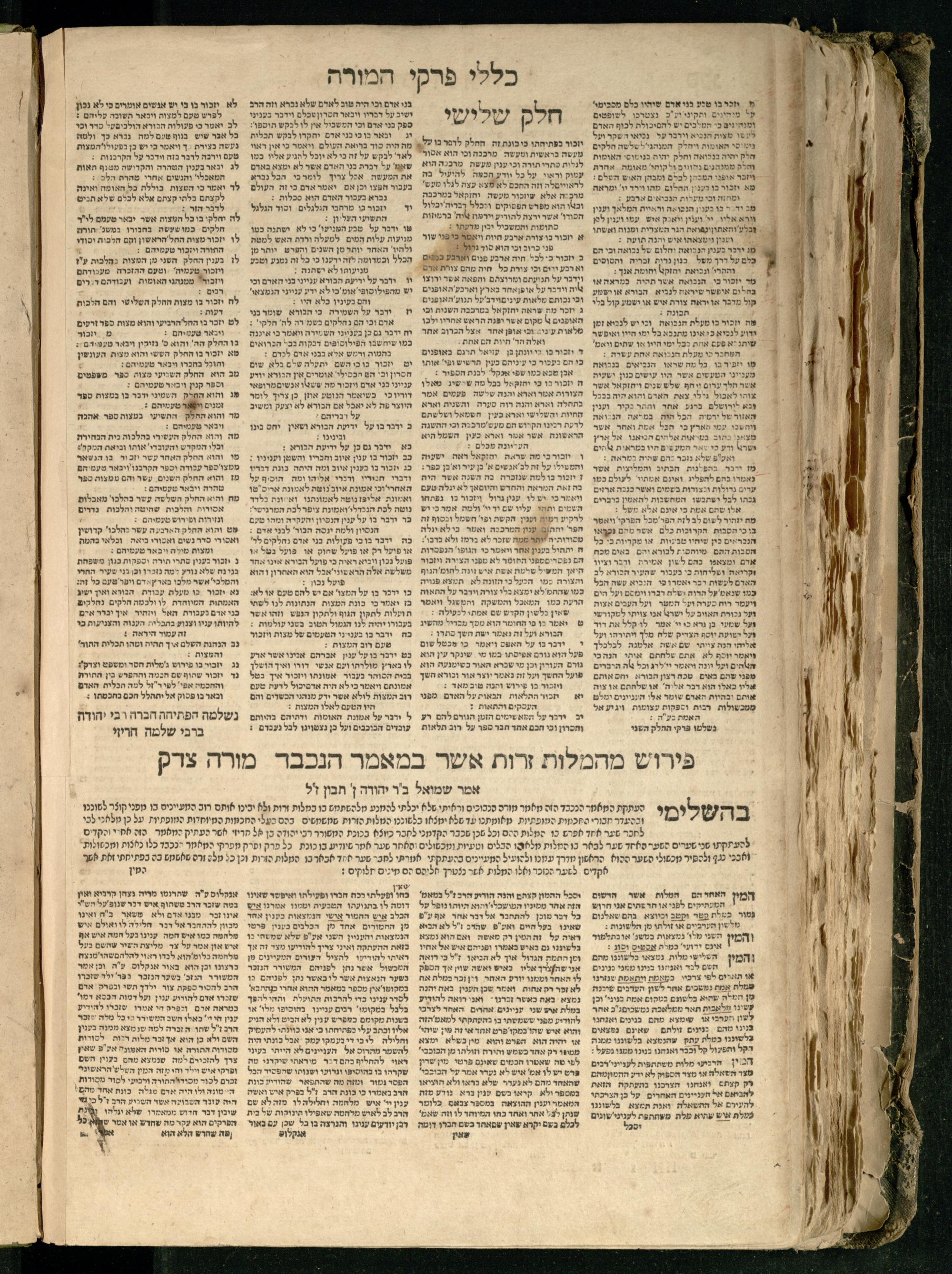 Moreh nevukhim = Doctor Perplexorum / le-ha-maʾor ha-gadol gaʾon Yiśraʾel ha-rav rabenu Mosheh bar Maimon ... u-perusho ... Shem Ṭov u-perush Efodi ... ṿe-hosafnu ... perush ... n. [Ibn] Ḳreśḳaś ... gam kaṿanat kol pereḳ ... ʿal daʿat ... he-Ḥarizi gam perush Milot zarot le-Ibn Tibon ... gam pesuḳe ha-Torah u-neviʾim u-ketuvim ... ʿal sidram ... hosafnu ʿal ha-rishonim le-hatsiv simanim ben maʾamarim she-be-moreh ...מורה נבוכים / להמאור הגדול גאון ישראל הרב רבינו משה בר מימון ... ופירושו שם טוב ופירוש אפודי ... והוספנו ... פירוש ן. [אבן] קרשקש ... גם כוונת כל פרק ... על דעת ... החריזי גם פירוש מלות זרות לאבן תבון ... גם פסוקי התורה ונביאים וכתובים ... על סדרם ... הוספנו על הראשונים להציב סימנים בין מאמרים שבמורה ...