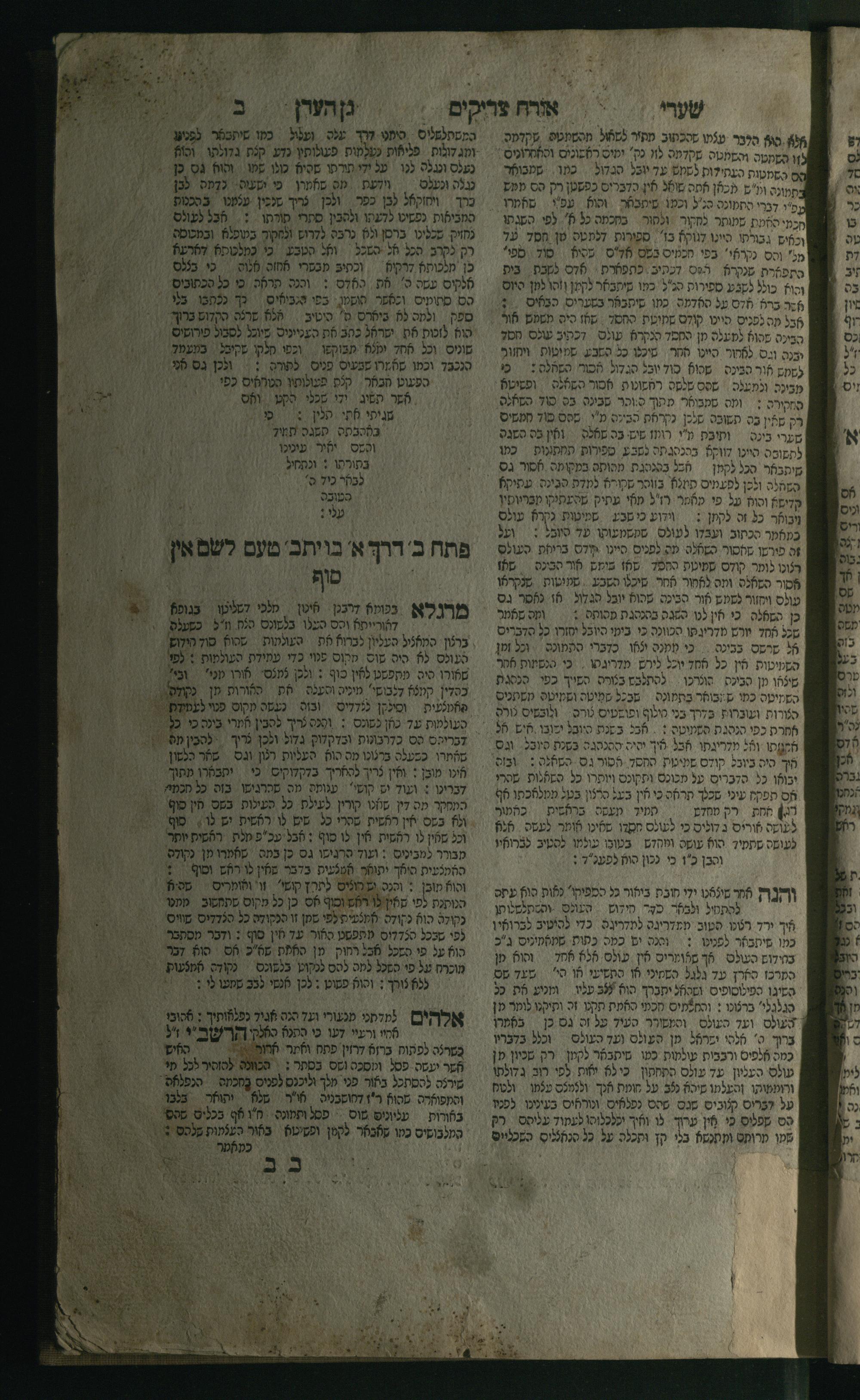 Sefer Shaʿar Gan ʿeden : ṿe-zot torat ha-adam ha-gadol ba-ʿanaḳim ... / kol zot ... shel ha-meḥaber ... mo. Yaʿaḳov Ḳopil z.l.h.h. asher or torato ... be-ḳ.ḳ Meziriṭsh gadol ... heʾir ha-shem et ... mo. Aharon ... Shats di-k.k. Meziriṭsh gadol ... tafkido le-varer ... le-heviʾo le-vet ha-defus ...ספר שער גן עדן : וזאת תורת האדם הגדול בענקים ... / כל זאת ... של המחבר ... מו׳ יעקב קאפיל זללה״ה אשר אור תורתו ... בק״ק מעזירטש גדול ... העיר השם את ... מו׳ אהרן ... ש״ץ דק״ק מעזירטש גדול ... תפקידו לברר ... להביאו לבית הדפוס ...