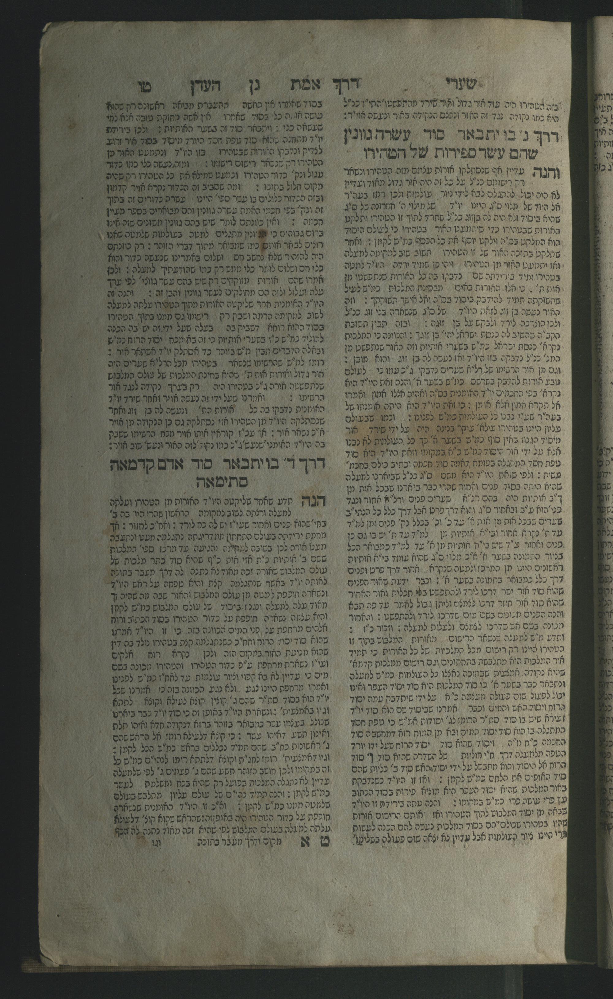 Sefer Shaʿar Gan ʿeden : ṿe-zot torat ha-adam ha-gadol ba-ʿanaḳim ... / kol zot ... shel ha-meḥaber ... mo. Yaʿaḳov Ḳopil z.l.h.h. asher or torato ... be-ḳ.ḳ Meziriṭsh gadol ... heʾir ha-shem et ... mo. Aharon ... Shats di-k.k. Meziriṭsh gadol ... tafkido le-varer ... le-heviʾo le-vet ha-defus ...ספר שער גן עדן : וזאת תורת האדם הגדול בענקים ... / כל זאת ... של המחבר ... מו׳ יעקב קאפיל זללה״ה אשר אור תורתו ... בק״ק מעזירטש גדול ... העיר השם את ... מו׳ אהרן ... ש״ץ דק״ק מעזירטש גדול ... תפקידו לברר ... להביאו לבית הדפוס ...