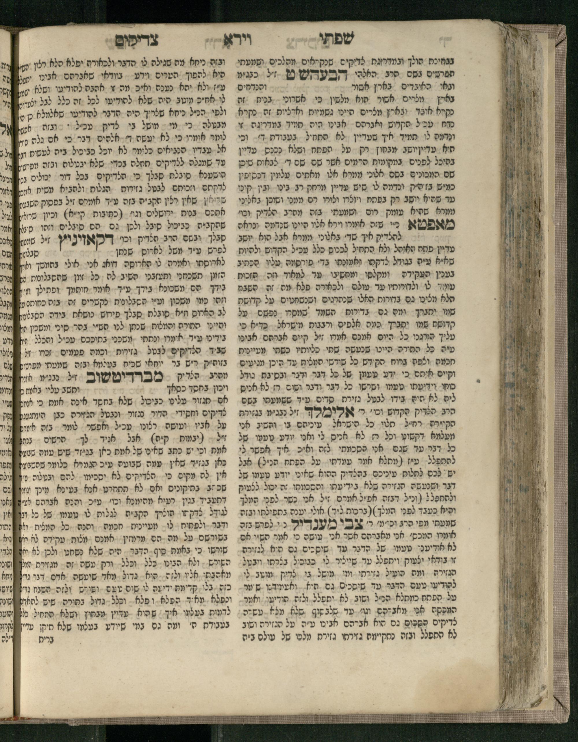 Sefer Śifte tsadiḳim / she-ḥiber ha-rav ... Pinḥas z.l. she-hayah a.b.d. u-mo.ts. be-Dinoṿits ... u-ṿe-ha-sefer ... nimtsa gam ḥidushe oraita mi-kamah tsadiḳim ... u-ṿe-yiḥud nimtsa kama ḥidushe oraita me-ha-Rav ha-tsadiḳ ṿe-khu. me-Apṭa z.l.l. ...ספר שפתי צדיקים / שחיבר הרב ... פנחס ז״ל שהיה אב״ד ומו״צ בדינאוויץ ... ובהספר ... נמצא גם חידושי אורייתא מכמה צדיקים ... וביחיד נמצא כמה חידושי אורייתא מהרב הצדיק וכ״ו מאפטא זל״ל ...