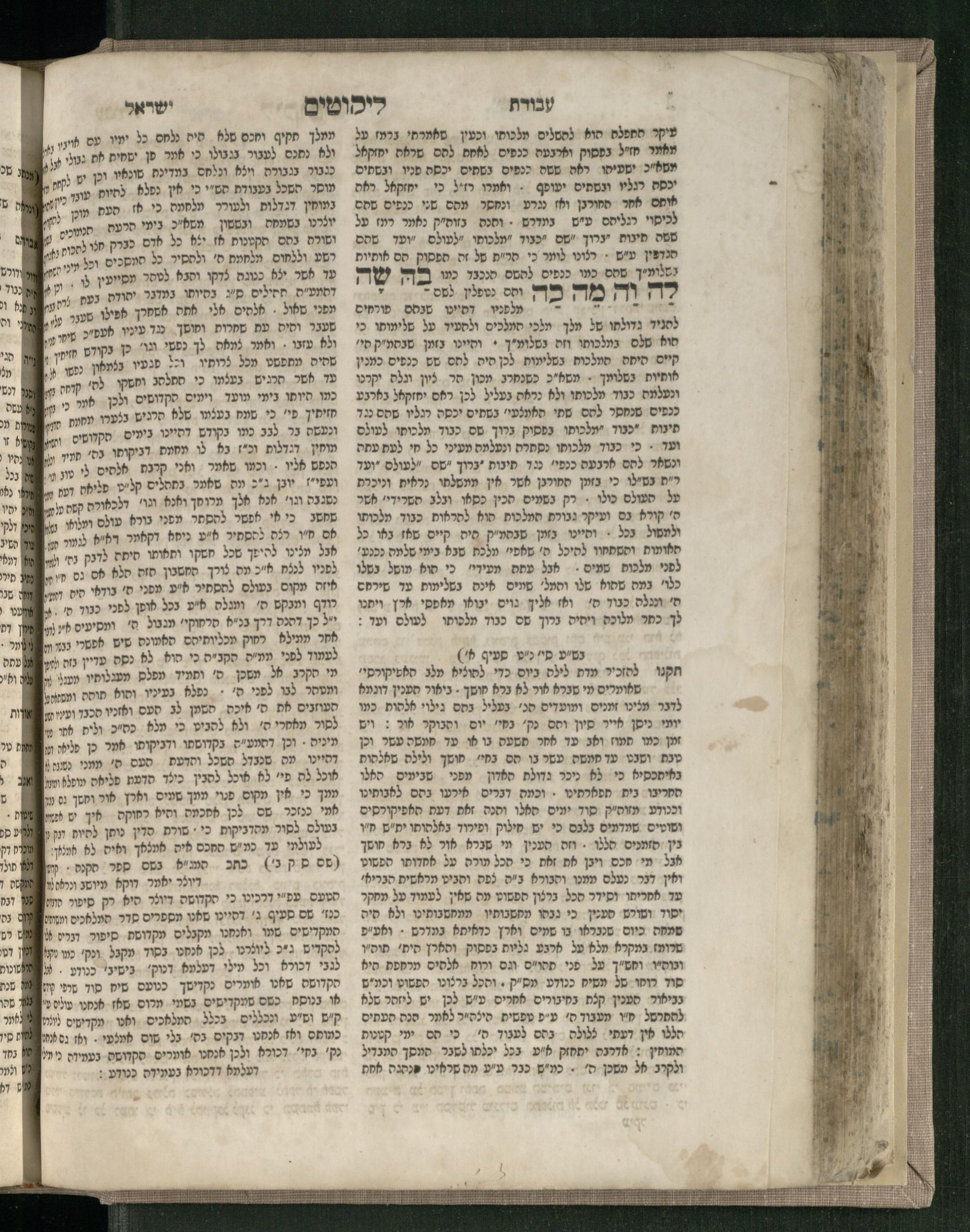 Sefer ʿAvodat Yiśraʾel / me-et ha-adam ha-gadol ... Yiśraʾel ... beha-manoaḥ ... Shabtai z.l. m.m. de-ḳ.ḳ. Ḳoznits ...ספר עבודת ישראל / מאת האדם הגדול ... ישראל ... בהמנוח ... שבתי ז״ל מ״מ דק״ק קאזניץ ...