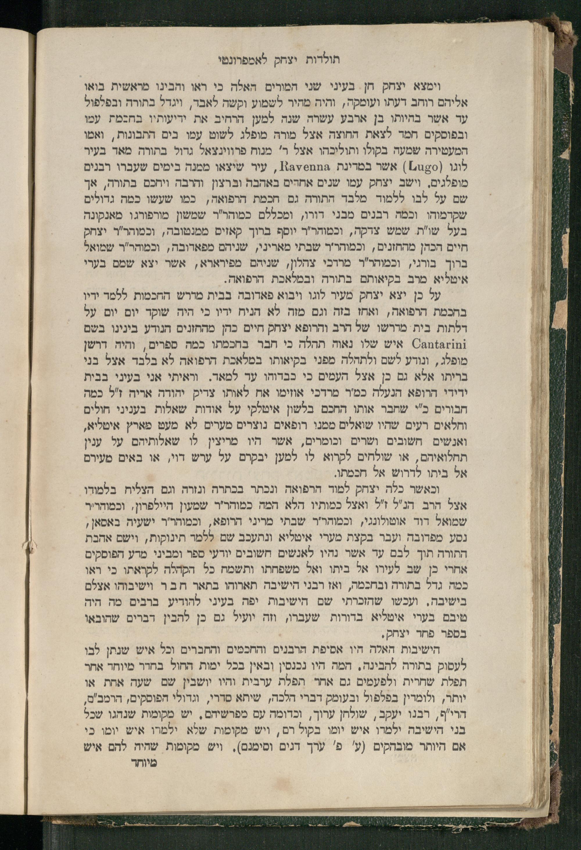 Sefer Toldot ha-Rav ha-gadol Yitsḥaḳ Lampronti, baʿal sefer Paḥad Yitsḥaḳ / melekhet ha-tsaʿir Yitsḥaḳ Barukh ha-Leṿi mi-Ferara, asher hayah be-talmidim be-vet midrash ha-rabanim be-Padobah ; yotse le-ʾor be-faʿam rishonah ʿal yede ḥevrat Meḳitse Nirdamimספר תולדות הרב הגדול יצחק לאמפרונטי, בעל ספר פחד יצחק / מלאכת הצעיר יצחק ברוך הלוי מפירארא ; יוצא לאור בפעם ראשונה על ידי חברת מקיצי נרדמים