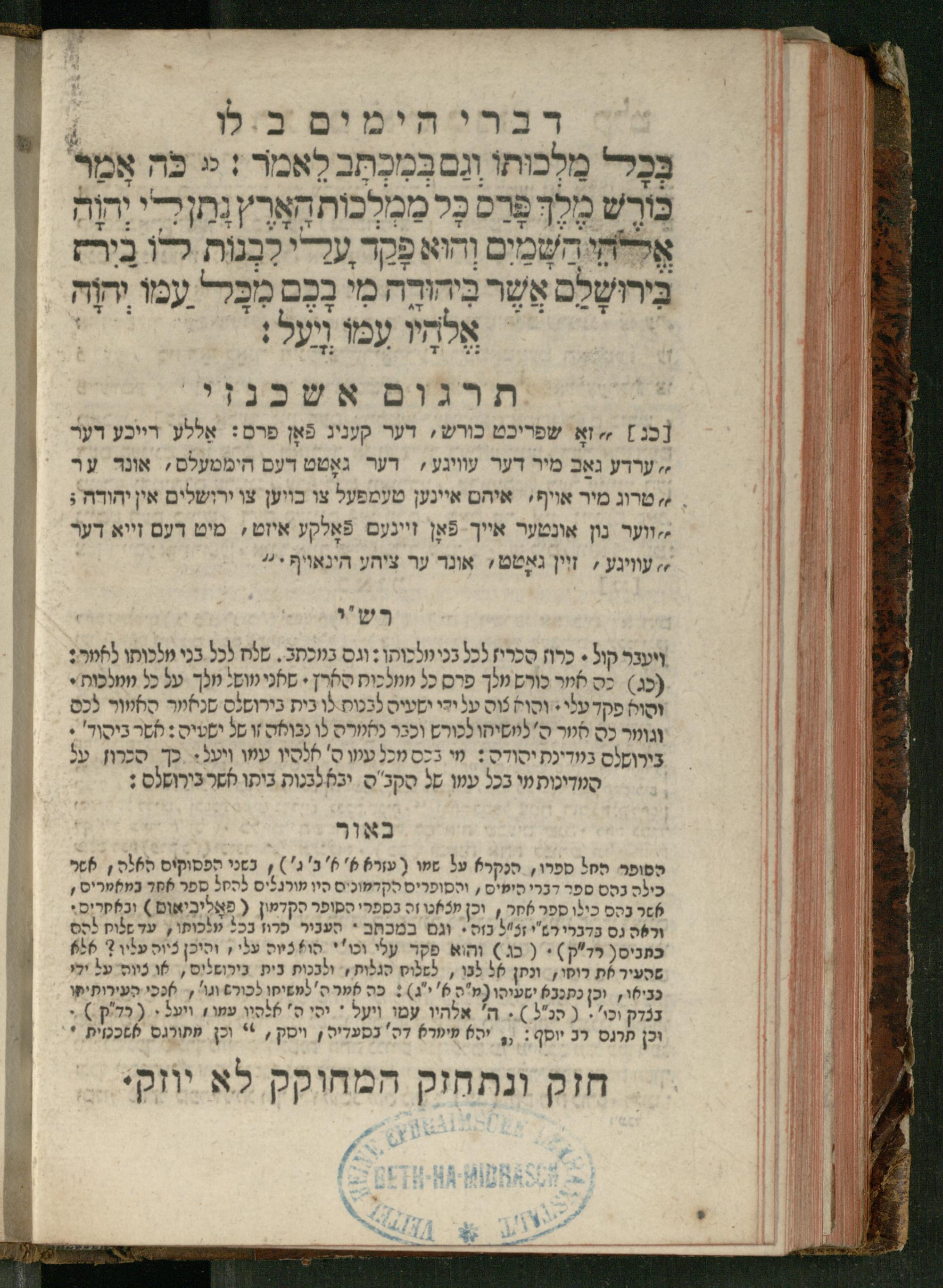 Sefer Divre ha-yamim 2 / meturgam Ashkenazit u-mevoʾar me-et Daṿid Oṭṭenzoser, gam hitsagnu bo perush ... Rashi z.ts.l., ṿe-nilṿeh elaṿ perush Mikhlal yofi ...ספר דברי הימים ב / מתורגם אשכנזית ומבואר מאת דוד אטטענזאסער, גם הצגנו בו פירוש ... רש״י זצ״ל, ונלוה אליו פירוש מכלל יופי ...