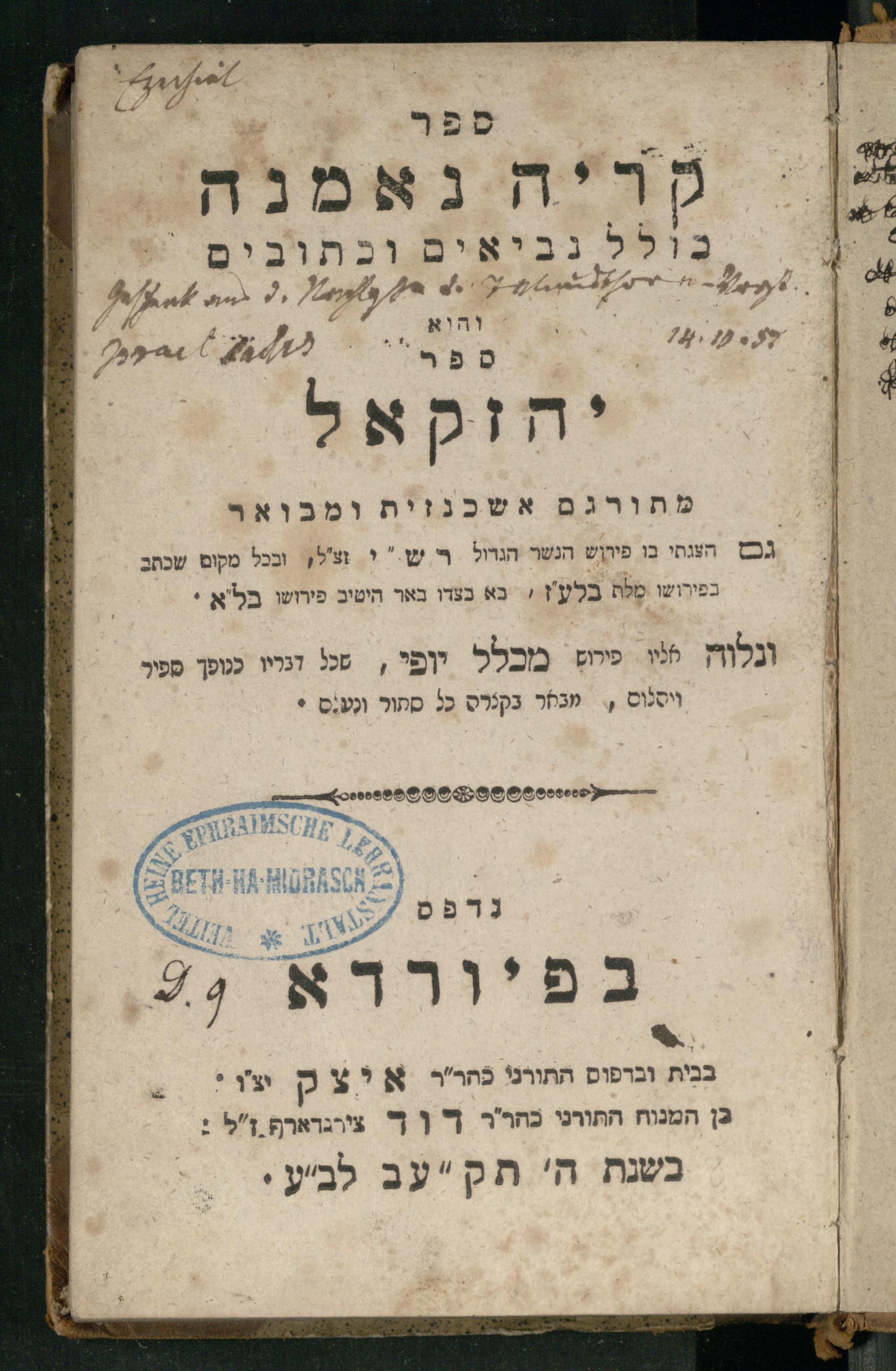 Ṿe-hu Sefer Yeḥezḳel / meturgam Ashkenazit u-mevoʾar, gam hitsagti bo perush ... Rashi z.ts.l. ... Ṿe-nilṿeh elaṿ perush Mikhlal yofi ...והוא ספר יחזקאל / מתורגם אשכנזית ומבואר, גם הצגתי בו פירוש ... רש״י זצ״ל ... ונלוה אליו פירוש מכלל יופי ...