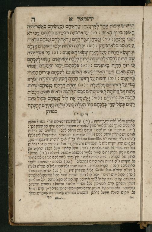 Ṿe-hu Sefer Yeḥezḳel / meturgam Ashkenazit u-mevoʾar, gam hitsagti bo perush ... Rashi z.ts.l. ... Ṿe-nilṿeh elaṿ perush Mikhlal yofi ...והוא ספר יחזקאל / מתורגם אשכנזית ומבואר, גם הצגתי בו פירוש ... רש״י זצ״ל ... ונלוה אליו פירוש מכלל יופי ...